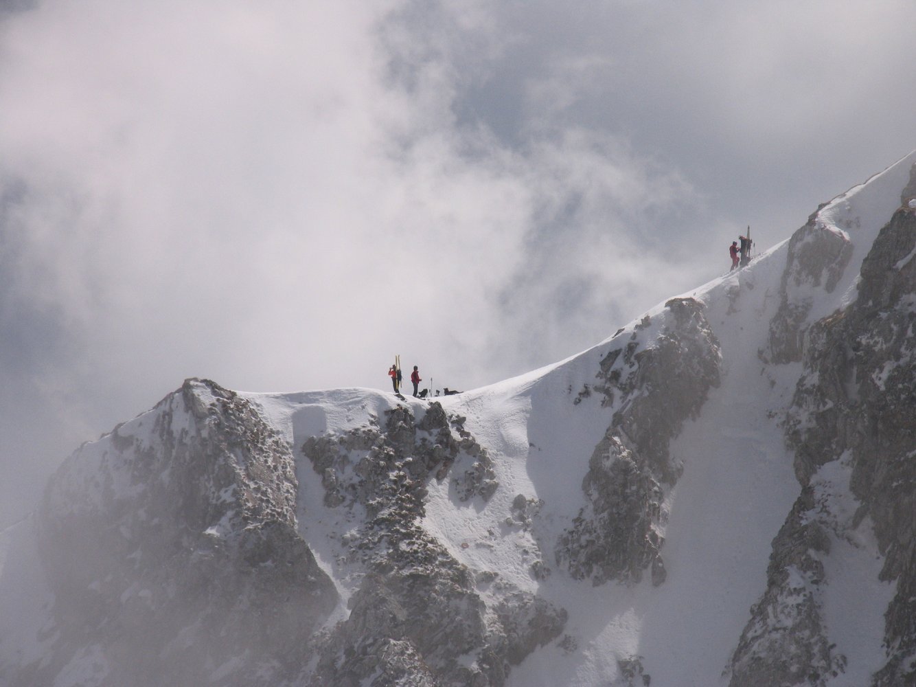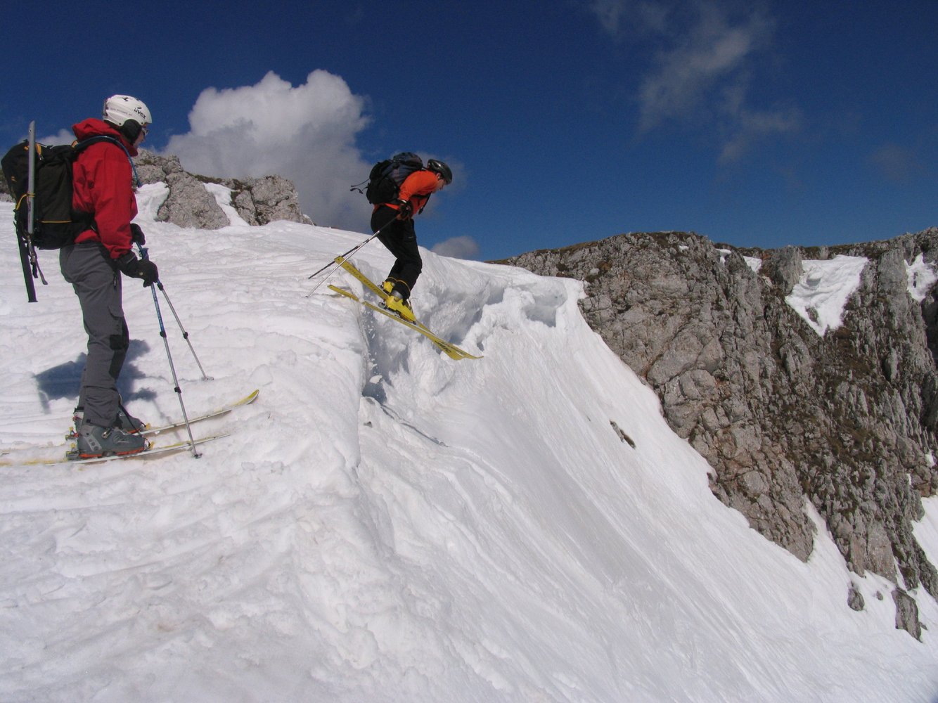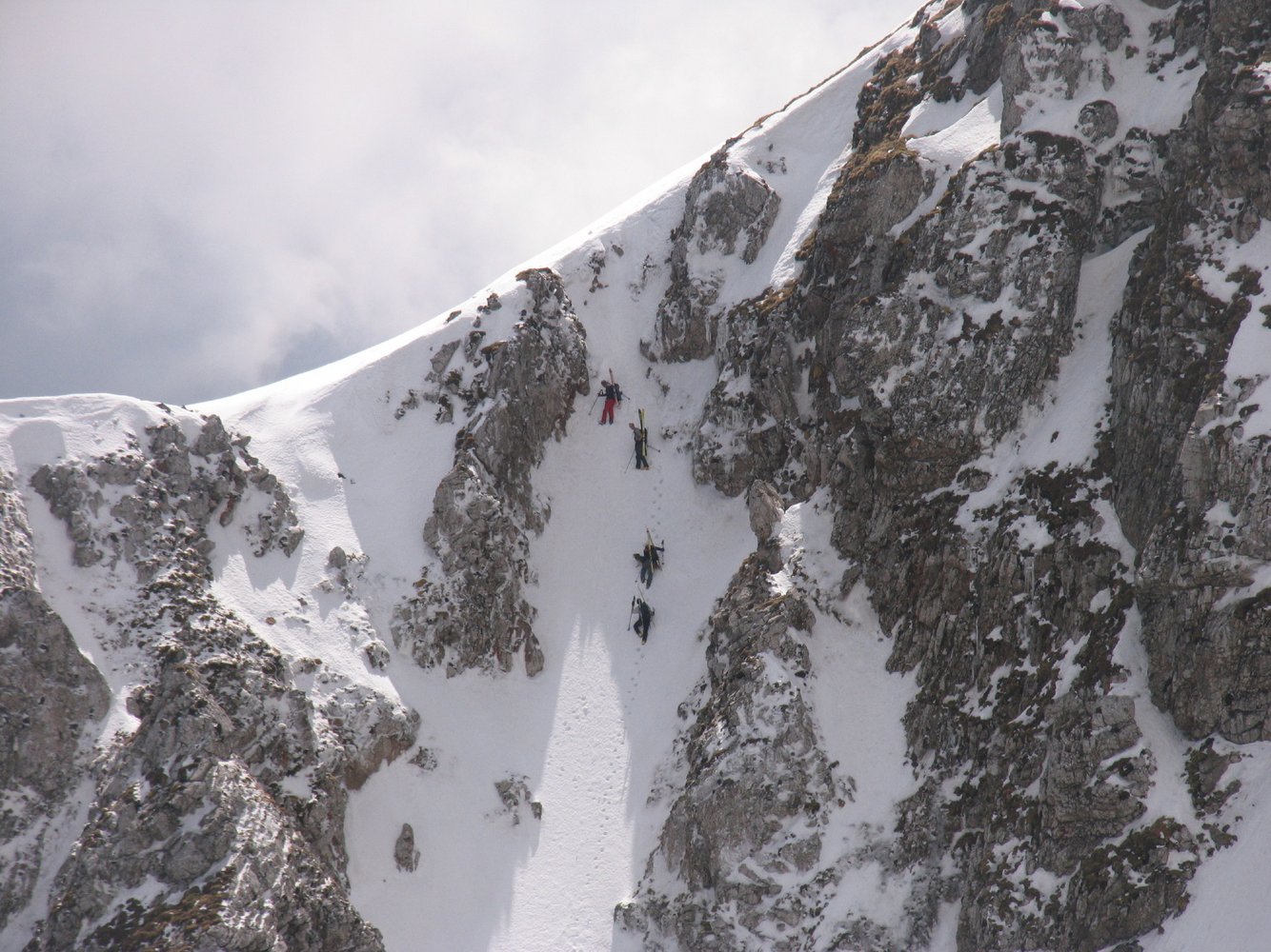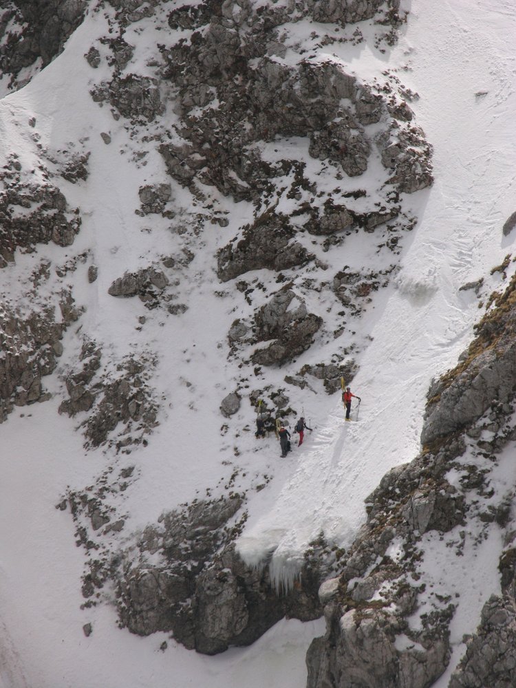 Nach dem Aufstieg über die Breite Ries und machten uns bereit für die Abfahrt der Privatries. Martin und Jürgen stiegen direkt über die 45° steile Privatries auf und meldeten Idealbedingungen in diesem Schneeberg IVer. Oben bei der Einfahrt hatte ich Herzklopfen und starrte in den steilen Hang. Neben mir stand Nils und teile mit mir die Aufregung. Prinzipiell habe ich meine Schier recht gut im Griff, aber natürlich fehlt mir etwas Routine.