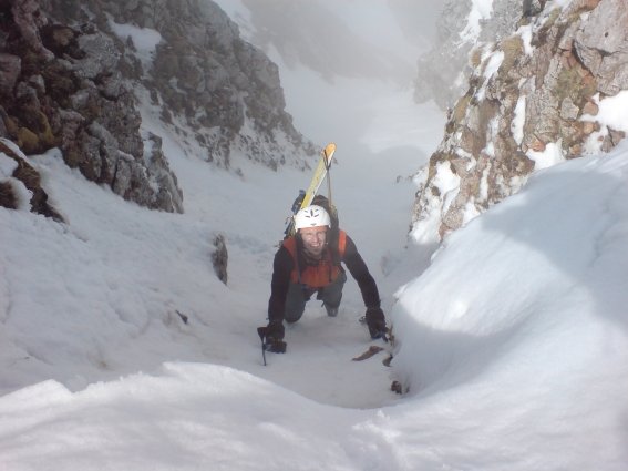 Danach tauschten wir die Schier gegen Steigeisen und stiegen über die steile Quellensteig-Rinne hinauf. Diese Einfahrt in die Breite Ries liegt sehr im Schatten, hat ca. 42° und ist sehr eng.