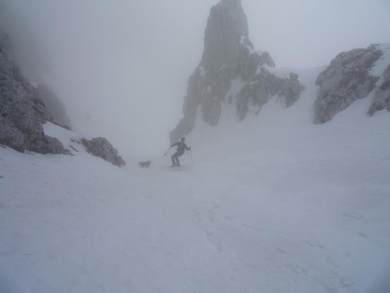 Wir fuhren bis zur Einfahrt der Krummen Ries und von dort querten wir nach links bis zu einer abfallenden Flanke. Der Nebel tauchte die Rinne in ein diffuses Licht und in eine mystische Stimmung.