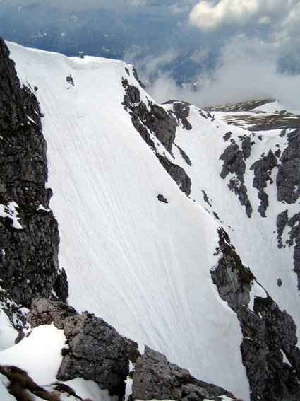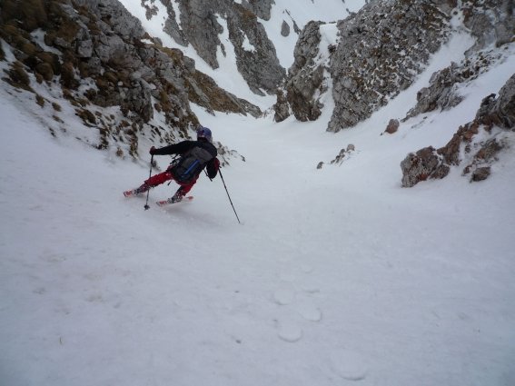 Die direkte Einfahrt hat sicher kurzfristig 80° und ist maximal 3 Meter breit. Somit kann man diese, meiner Meinung nach, nur über die linke Seite einfahren. Wir haben uns vor den letzten steilen vier Metern eine kleine Stufe geschlagen und uns dort die Schi angeschnallt.