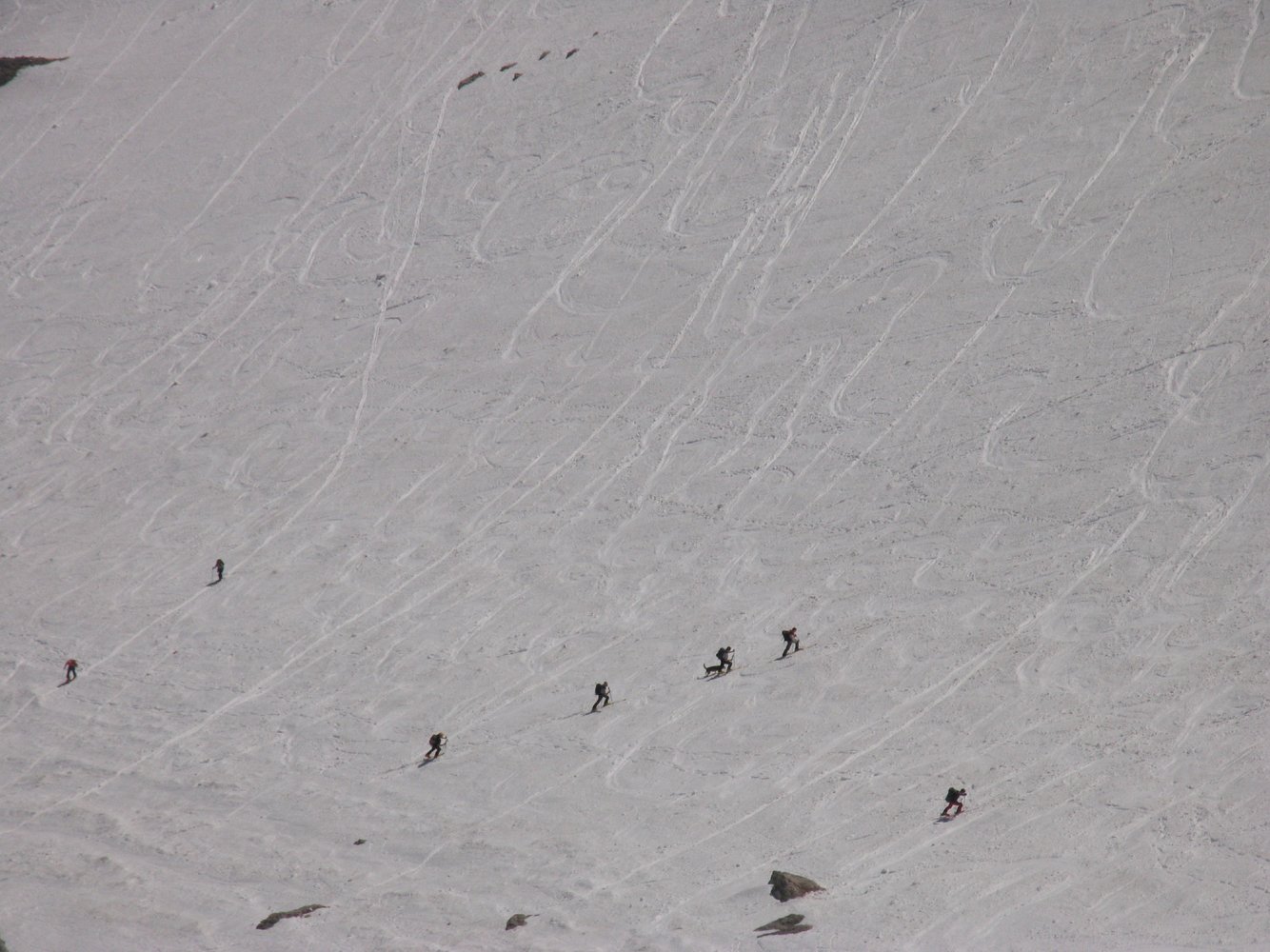 Vom Fadensteig zweigten wir zur Einfahrt unserer ersten Steilrinne, die Rote Schütt Flanke, ab. Diese hat 39° und ist mit III-IV bewertet. Die Einfahrt ist recht steil, legt sich aber bald zurück und wird dann etwas flacher.