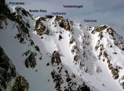 Daher sollte man sich vor einer geplanten Abfahrt genau über die Lawinensituation erkundigen. Auch beim Hinfahren zum Berg bleibe ich des öfteren stehen und sehe mir die Tour von unten genau an. Ich studiere die wahrscheinliche Abfahrtslinie - gerade in Flanken sieht man eventuelle Felsabstürze oder unfahrbare Engstellen oft nur von unten. Nach Möglichkeit ist ein Aufstieg, bei dem man bereits die Rinne oder Flanke einsehen kann, zu bevorzugen. Vor der Abfahrt versuche ich den Einfahrtsbereich aus einem anderen Blickwinkel zu erkunden- hat schon manchmal vor unliebsamen Überraschungen geholfen.