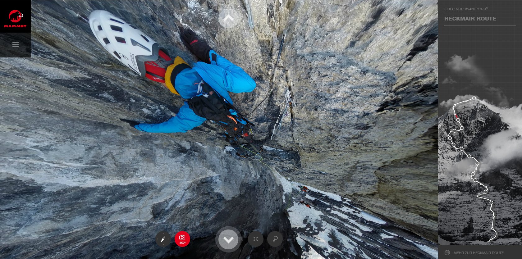 Spektakuläre Bilder aus der Heckmair-Route waren nur ein Aspekt des „Project360“: Die außergewöhnlichen Ansichten der Route tragen zu einem einmaligen und neuartigen Nutzer-Erlebnis bei und machen die Website www.project360.mammut.ch zu einer Art vertikalem Street View. Rolf Schmid, CEO von Mammut, ist persönlich begeistert von den Eindrücken aus der Eiger-Nordwand: „Mit ‚Project360‘ erweitern wir das, was Google mit Street View in Länge und Breite umsetzte: Wir eröffnen mit einer Tiefenansicht eine dritte Dimension – und das in einer weitaus höheren Qualität als bislang möglich.“