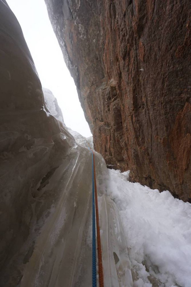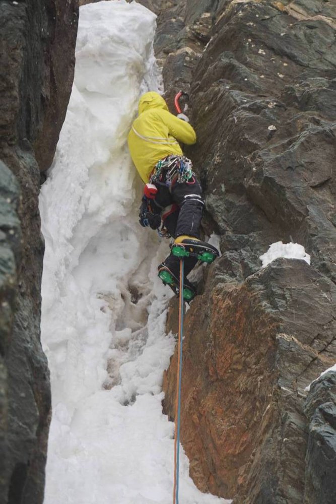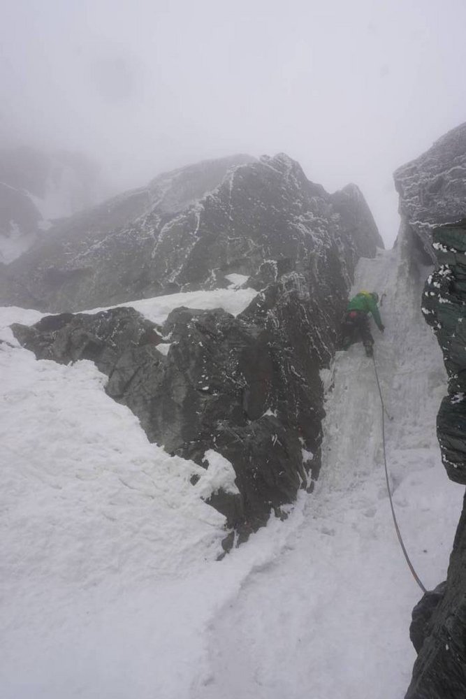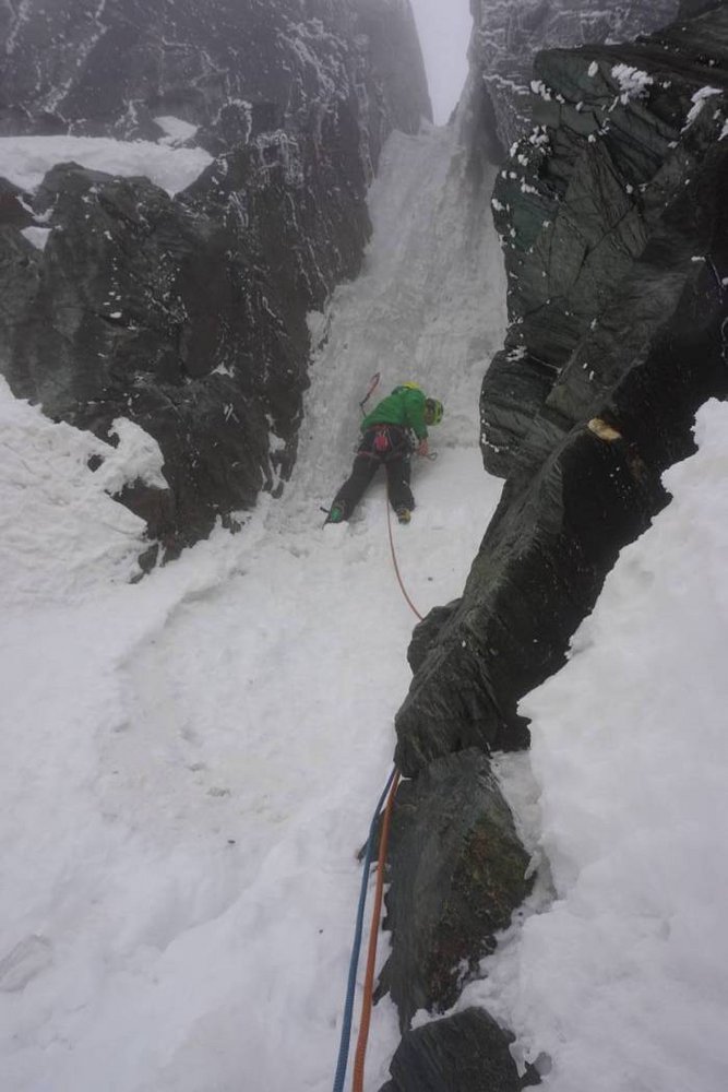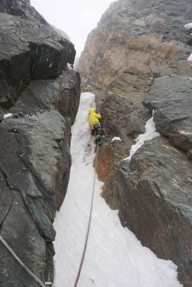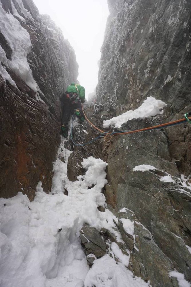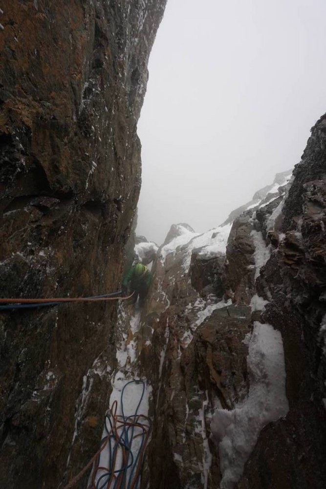 Nach einer kurzen Stapferei, wurde das Gelände wieder steiler. Mit einer kleinen links-rechts Schleife konnten, wir die steile und etwas brüchige Rinne umgehen. Ein sehr origineller und enger Durchschlupf leitete uns dann wieder in die Rinne, wo wir den Stand aufbauen konnten. Weitere 40 Meter fast schottischer Kletterei, führten uns zum Südgrat, wo die Rinne im Prinzip endet. Wir wollten aber nicht über den Südgrat aussteigen, sondern, um die Kletterei homogen zu halten, seilten wir ca. 20 Meter in die Pillwax Rinne ab und stiegen über diese auf.