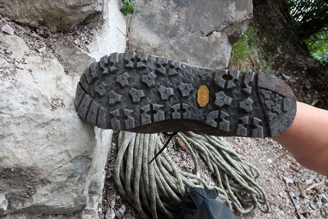 Die Vibram-Sohle ist komplett in Schwarz gehalten, neben den schon beschriebenen guten Felskletter-Eigenschaften ist die gut strukturierte Gummisohle auch auf lehmigen Erdpassagen dort, wo man den Fuß hinsetzt und bleibt ohne viel rutschen stabil. Um den Schuh ist ein hochgezogener Sohlenrand, der das Leder bei grobem Geröll gut schützt. Gut gefällt uns natürlich auch der Aufhänghaken oberhalb der Ferse, so kann man das Paar Link GTX beim Klettern einfach hinten mit einem Karabiner an den Hüftgurt hängen.