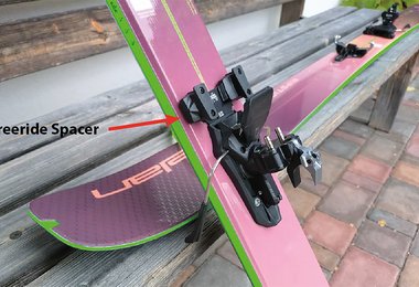 Vorne hat man einen großen Hebel zum Niederdrücken (öffnen des Frontbackens) und ein "Easy Entry System" (also quasi eine ausgeklügelte Geometrie zwischen Sohlenauflage und Pins) ermöglicht ein sicheres Einsteigen, auch wenn die Sohlen der Schuhe etwas abgenützt sind. Hinten beim Stopper empfiehlt sich für die Freunde der gehobenen Abfahrt der sogenannte Freeride-Spacer, der es ermöglicht, dass die Schuhe nicht nur in den hinteren Bügel hängen, sondern dass der Schuh auf dem Ski im Bereich des Stoppers auf dem Ski aufliegt (der Freeride-Spacer wiegt 29 Gramm und ist Zubehör, welcher den Abfahrtskomfort deutlich steigert).