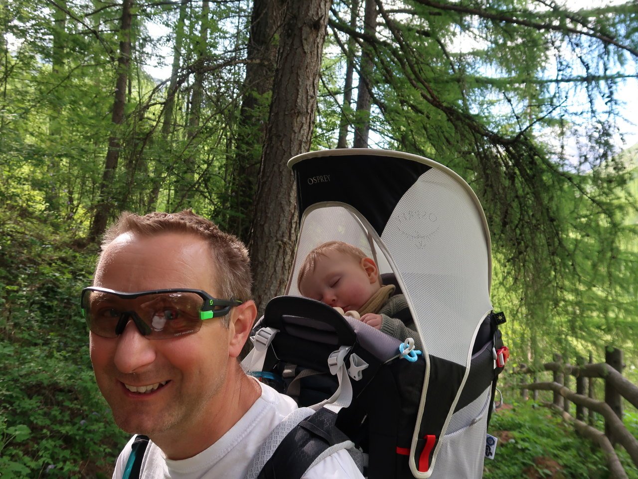Die Kindertrage verfügt über einen eingebauten Sonnenschutz mit Sonnenlichtschutzfaktor 50 und UV-Schutzfaktor 22, sowie eine integrierte Regenhülle. Aufgrund der verstellbaren Sicherheitsschultergurte, dem höhenverstellbaren Kindersitz und der Steigbügel, passt sich die Trage an die Größe und das Gewicht des Kindes an und wächst somit mit dem kleinen Abenteurer mit. Das Autorenkind findet die Trage jedenfalls so bequem, dass es darin auch gut schlafen kann.
