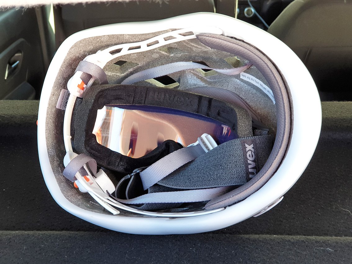 Man hat also genau genommen immer 2 unterschiedliche Glastönungen dabei, für jedes Wetter quasi die richtige Sichtoption. Und siehe da – obwohl die PVC-Scheibe (Glas ist es ja nicht) unter dem bunten Glas eine leichte Gelbtönung hat, sieht man damit in der Nacht beim Abfahren mit der Stirnlampe perfekt. Wir waren echt überrascht, wie klar und gut man gesehen hat, einer von uns hatte sogar einmal keine Stirnlampe mit und musst quasi vom anderen Lichtkegel bedient werden – kein Problem mit der Uvex g.gl 3000 To.