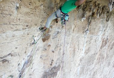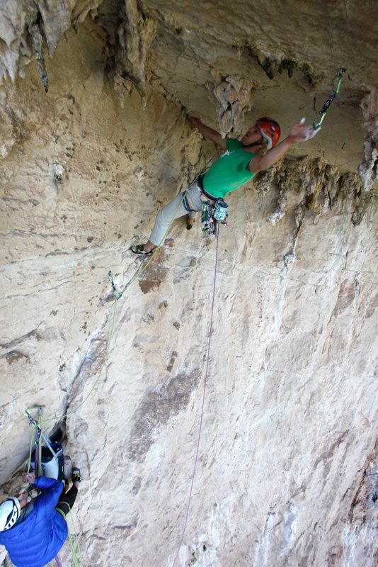 Ein paar Tage später starteten Paul und ich erneut zur Nordwand. Ein mit Stalaktiten durchsetztes Dach in etwa 120 Metern Wandhöhe faszinierte mich schon bei unserer Ankunft. Mit dem Fernglas konnte ich eine logische Linie zum Dach erspähen. Die Erschließung von unten verlief äußerst spannend, da oberhalb der Dachkante mit dem Fernglas keine Struktur ersichtlich war und diese auch erst bei Erreichen der Dachkante erkennbar wurde. Wie bestellt tauchte genau im richtigen Abstand zur Kante eine Leiste auf. Die Freude war groß, die Linie kletterbar.