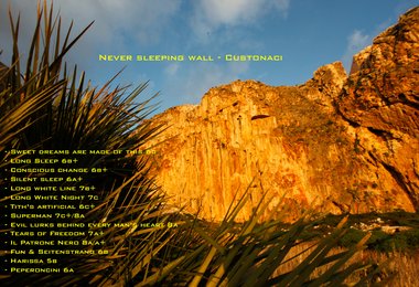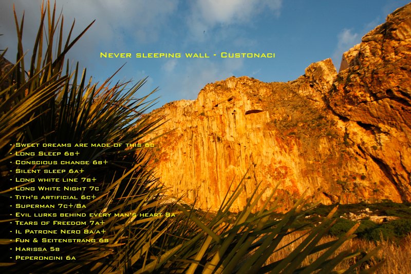 Ich hatte mir die Erschließung eines gesamten Sportklettersektors, sowie eine Mehrseillängenroute als Ziel gesetzt. An der bis zu hundert Meter hohen und unglaublich versinterten Wand bei Custonaci, bzw. mit der Nordwand des Monte Monaco waren die Ziele rasch gesteckt. Etwa 500 Meter vom Meer entfernt, westseitig ausgerichtet, direkt neben der bekannten Grotta Mangiapane liegt die fast schon surreal anmutende „Never sleeping wall“.