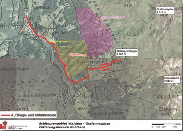 Um Wildtiere nicht zu stören und Schäden an Jungbäumen zu vermeiden, sollten Tourengeher/innen nur die gekennzeichneten Aufstiegs- und Abfahrtsrouten benützen, die im Gelände auf den Hinweistafeln dargestellt sind. Fütterungsstellen sollten umgangen/umfahren werden.