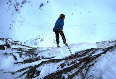 Abstieg: Durch Abseilen über die Route "Deja Vue" 60m Doppelseil erforderlich.