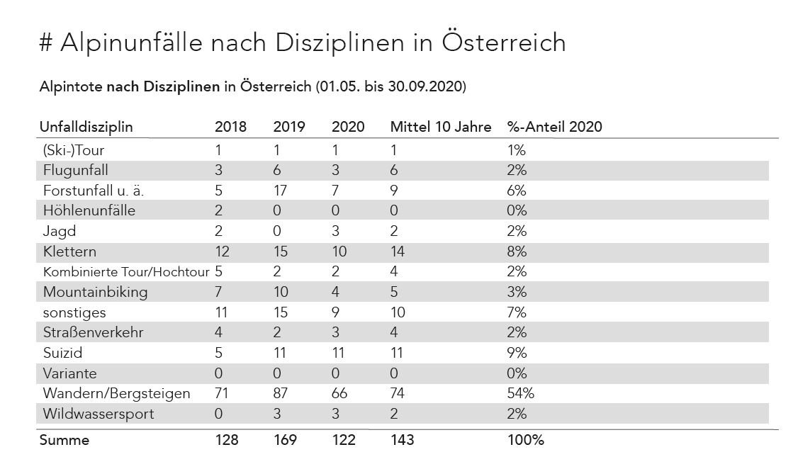 Die Alpinunfallstatistik des Österreichischen Kuratoriums für Alpine Sicherheit stellt für den Zeitraum vom 1. Mai bis 30. September 2020 eine Zunahme an Alpinunfällen von mehr als 30% im Vergleich zum Durchschnittswert der vergangenen zehn Jahre fest. In diesem Zeitraum ereigneten sich insgesamt 3.204 Unfälle, die von der Alpinpolizei aufgenommen wurden. 74% der tödlichen Unfälle (90 Tote) ereigneten sich in den Monaten Juli, August und September. Wobei die Kalenderwochen 30, 31, 33, 34 und 38 einen traurigen Peak darstellen. In diesem Zeitraum gab es mehr als 200 Alpinunfälle pro Woche. Allein in der letzten Juliwoche (KW 31) registrierte die Alpinpolizei 268 Unfälle – Tote, Verletzte und Unverletzte sind in dieser Zahl zusammengefasst. Insgesamt verunfallten mehr Männer (60%) als Frauen (40%).