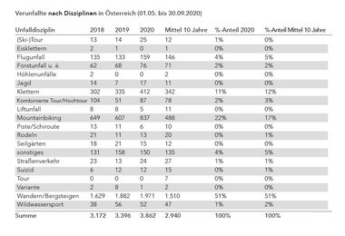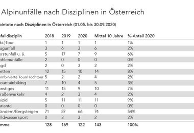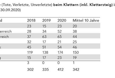 Die Alpinunfallstatistik des Österreichischen Kuratoriums für Alpine Sicherheit basiert auf der Alpinunfalldatenbank der Alpinpolizei. Die genannten Zahlen gehen auf eine Abfrage vom 5. Oktober 2020 zurück. Spricht das Kuratorium für Alpine Sicherheit von Verunfallten, bezieht es sich auf die Gesamtzahl an Toten, Verletzten und unverletzten Personen. Diese liegt für den Erfassungszeitraum bei insgesamt 3.862. Verletzt haben sich 2.527 Personen. Unverletzt geborgen wurden 1.213. Blickt man auf den Mittelwert der vergangenen zehn Jahre – Gesamt-Verunfallte: 2.940, Verletzte: 1.887, unverletzt Geborgene: 909 – ist die Zunahme vor allem bei unverletzt geborgenen deutlich.