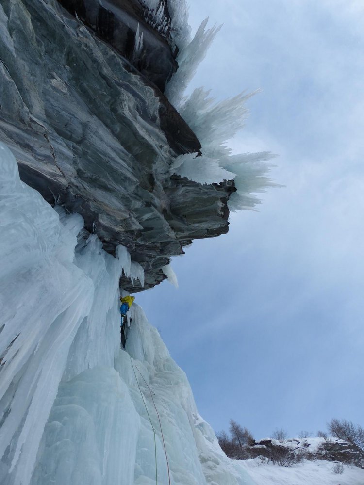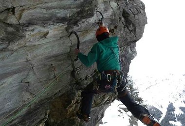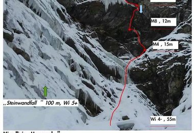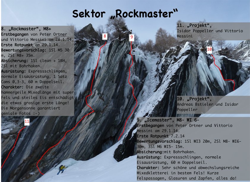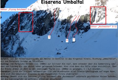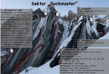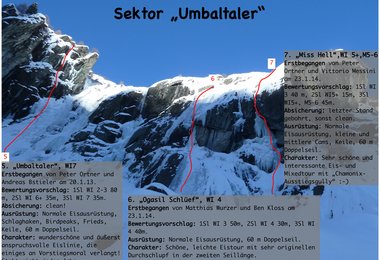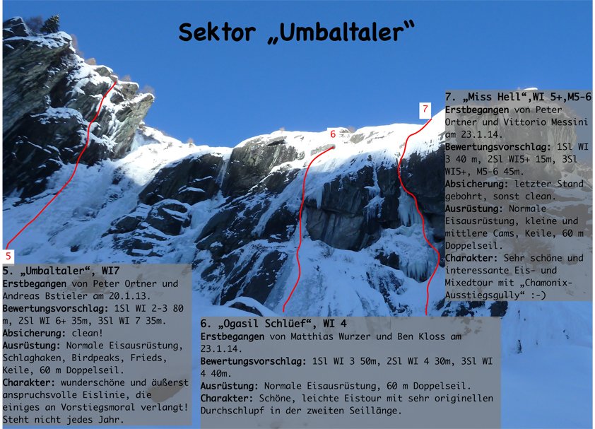 Weiter talauswärts befindet sich der Sektor „Umbaltaler“, wo neben der gleich benannten Route, eine originelle Eislinie und eine wunderschöne aber nicht zu unterschätzende leichtere Mixedtour („Miss Hell“) auf Wiederholern warten. Noch weiter rechts ums Eck ist der Sektor „Rockmaster“ ersichtlich. Hier gibt es zwei hammergeile Mixedtouren zu holen, die wie der Name schon verrät, aus zwei drittel Felskletterei („Rockmaster“) oder aus zwei drittel Eiskletterei („Icemaster“) bestehen. Die „Rockmaster“ verlangt in der ersten Länge leichte clean-Kletterei, hingegen ist die „Icemaster“ komplett eingebohrt. Fotogen sind sie auf jeden Fall beide!