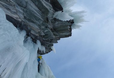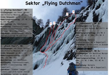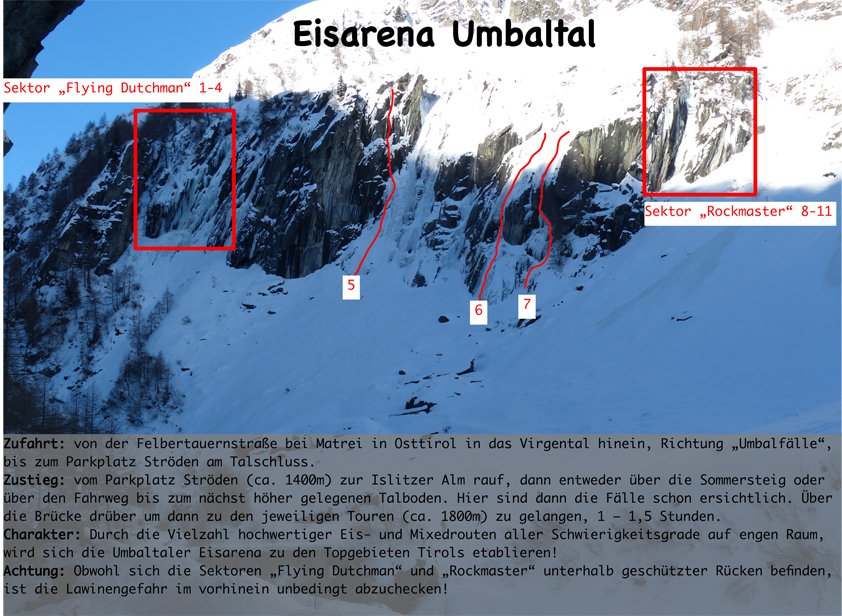 Letztes Jahr „entdeckten“ Ortner Peter und Bstieler Andreas eine Eisarena im hintersten Virgental, bei den Umbalfällen. Sie schnappten sich gleich die offensichtlichste Linie und es kam eine sehr schwere Eis- und Mixedtour heraus, die „Umbaltaler“. Mitte Jänner dieses Jahres startete die zweite „Erschließungswelle“, immer von unten aus startend, die drei leichtere Eislinien und einige mittelschwere Mixedlinien hervorbrachte. Jetzt kann man die Arena mehr oder weniger in drei Sektoren unterteilen: „Flying Dutchman“, „Umbaltaler“ und „Rockmaster“. Im Sektor „Flying Dutchman“ findet man zur Rechten, schöne und massive Eislinen vor, wie die „Dabermannl – und weibl“ und zur Linken sind zwei lange Mixedlinien durch ein riesiges Dach verlaufend entstanden. Richtig geile Nummern! Diese lassen sich über einen leichten Vorbau (WI3) erreichen. Der Fels bietet sich zwar super zum hooken an, ist aber zu geschlossen um vernünftig clean klettern zu können. So haben wir beide Routen komplett eingebohrt.