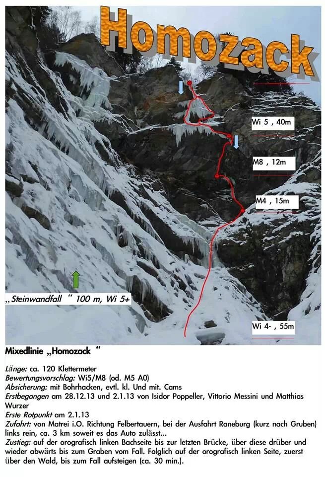 Die heuer nicht aufzuhören scheinende Südwestwetterlage macht das Eisklettern in Nordtirol und Salzburg, sowie in den tiefer gelegenen Gebieten Süd- und Osttirols zum Ding der Unmöglichkeit. Dadurch hat es uns in dieser Eissaison zu den höher gelegenen Eisfällen getrieben. Die Anzahl solcher Eisfälle und Mixedtouren ist in Osttirol bisher jedoch relativ bescheiden gewesen, was uns auf die Suche nach neuen Linien gebracht hat. Fündig sind wir Mitte Dezember von der Felbertauernstraße aus gesehen geworden. Zapfen und Glasuren umrahmen ein großes Dach rechts des klassischen Steinwandfalles bei Raneburg. Mit Keile, Friends und Bohrmaschine starten Isidor Poppeller und Vittorio Messini kurz nach Weihnachten zu dieser Linie rauf und siehe einer an, es lässt sich relativ gut kraxln! Man muss zwar eine rechts links Schleife in Kauf nehmen, denn der direkte Zapfenausstieg gibt keine natürliche Struktur her. Trotzdem ist es eine echt coole und teilweise recht ausgesetzte Linie geworden, die laut älterer Fotos ziemlich verlässlich jedes Jahr steht. Mittlerweile hat die „Homozack“ schon ein paar Begehungen bekommen...