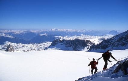 Sie gilt als eine der schönsten Skitouren im gesamten Alpenraum - „Österreichs National Skitour“ – die Dachstein-Überquerung. Start zur „National Skitour“ ist auf fast 2700 Metern Seehöhe auf der steirischen Seite, das Ziel liegt im oberösterreichischen Obertraun. Österreichs National Skitour ist der spektakulärste Weg, um das UNESCO Welterbe Dachstein zu „erfahren“. Es wird eine Strecke von über 20 km zurückgelegt, großteils in Form von Abfahrten. Die Dachsteinüberquerung dauert zwischen 4 und 5 Stunden, natürlich gibt es zwischendurch Möglichkeiten zum Einkehren und Rasten. In Obertraun steht dann ein Rücktransfer bereit (Voranmeldung bei der Kassa der Dachstein Gletscherbahn nötig).
