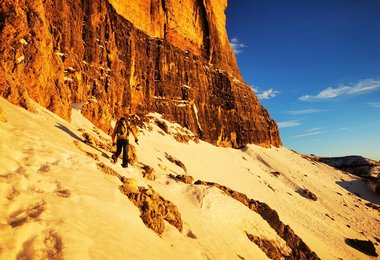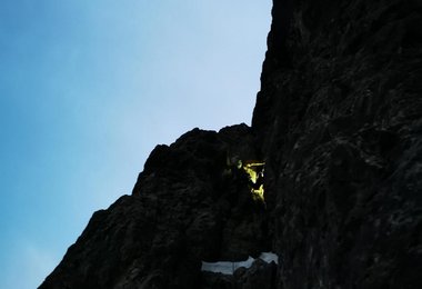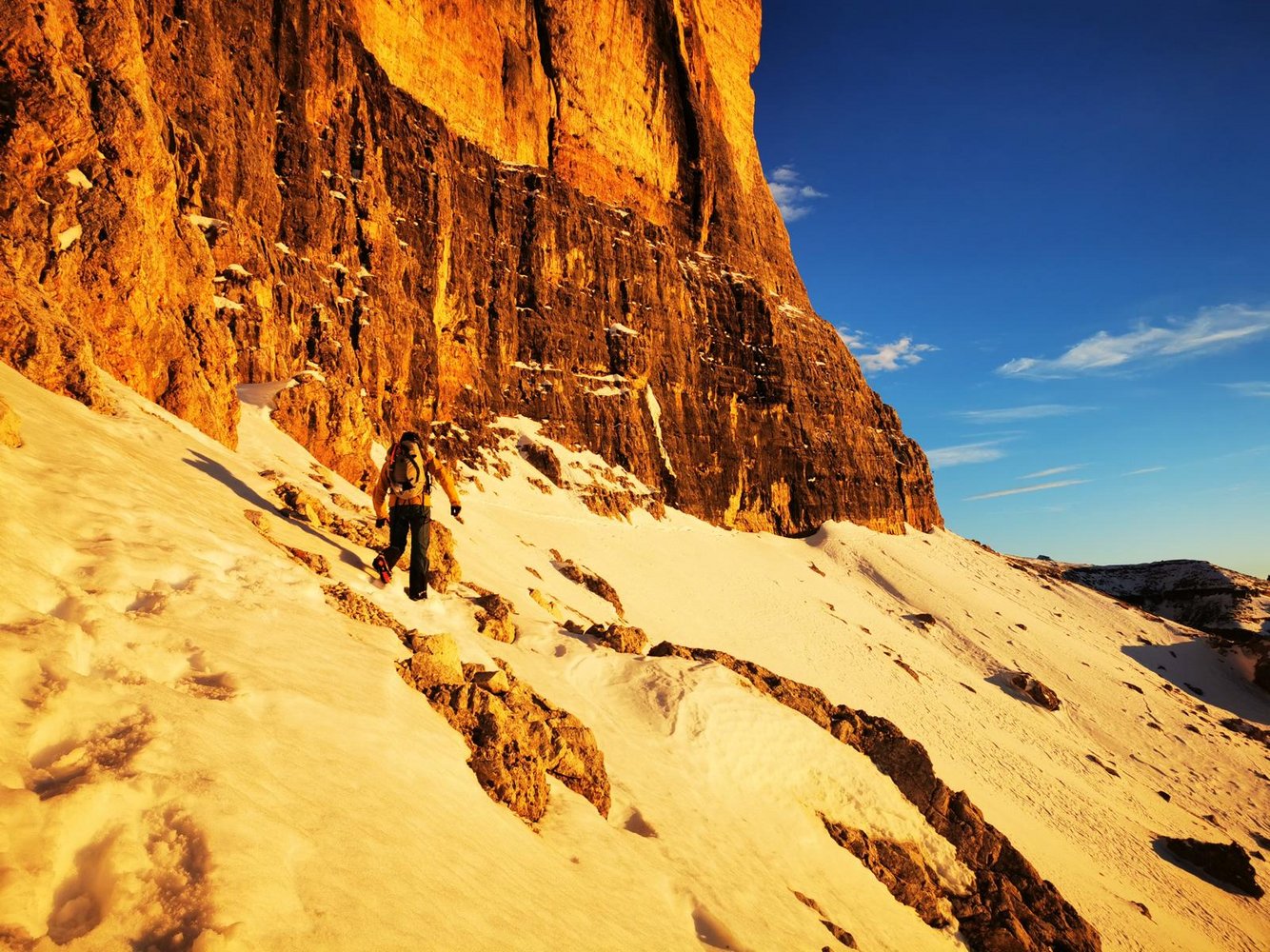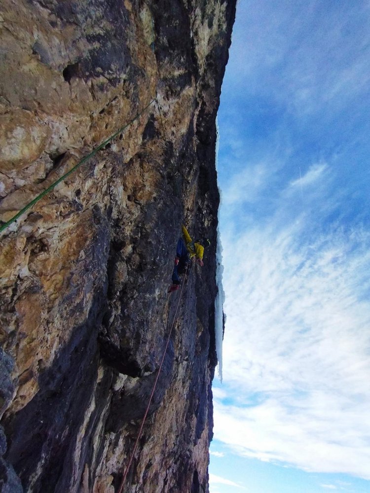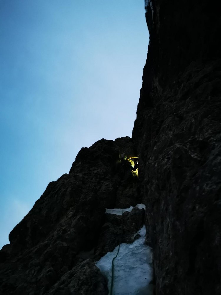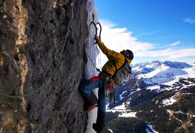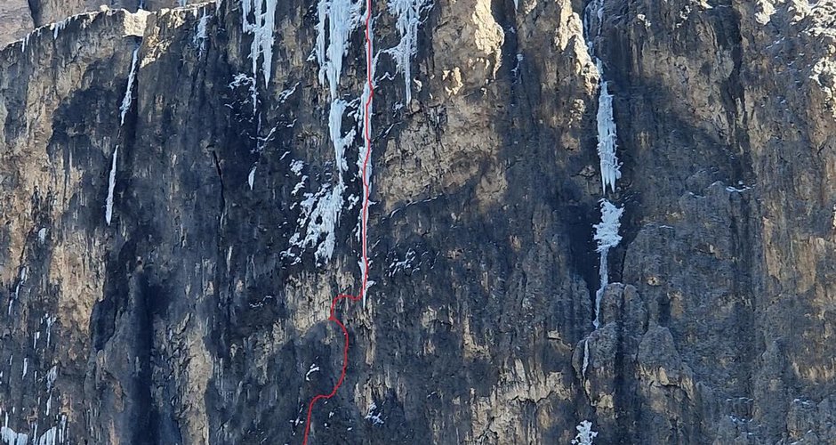Unsere Geschichte am Pordoi beginnt bereits 2016. Es müsste doch möglich sein den Eisfall, der sich an der imposanten Westwand des Pordoi von Zeit zu Zeit bildet, von unten anzuklettern. Nach langem Recherchieren und Stöbern in den Kletterführern waren wir der Meinung, dass wir links von der Pisciadoiführe von Karl Unterkircher eventuell noch eine freie Linie finden könnten. Also starteten wir am 24.12.2016 das erste Mal in die Wand. Den unteren ca. 120m hohen Vorbau kletterten wir seilfrei, zudem schleppten wir unsere gesamte Eisausrüstung mit uns. Unsere Motivation an diesem Tag musste fast grenzenlos gewesen sein, denn wenn ich jetzt zurückdenke war es an diesem Tag nahezu unmöglich den weit oben in der Wand hängenden Eisfall zu erreichen. Im unteren Wandteil brauchten wir die Eisausrüstung sicherlich nicht, denn es war bis zu diesem Zeitpunkt ein sehr niederschlagsarmer Winter, daher war auch der Fels trocken. Wir kletterten den Vorbau nach links hoch bis zu einem Pfeilerkopf. Von dort stiegen wir zwischen der Adang – und Pisciadoiführe direkt in die Wandflucht ein. Es waren sehr schöne lange Seillängen, die uns unserem Ziel langsam näherbrachten, zudem konnte man sie relativ gut absichern und durch den strukturierten Fels ergaben sich einige gute Sicherungsmöglichkeiten an Sanduhren. Einzig bei den Ständen versenkten wir einen Haken. Die Stunden verstrichen und gegen 14.00 Uhr kletterte ich eine kleine Verschneidung mit einem anschließenden Rechtsquergang zu einem kleinen Absatz. Zu meiner Verwunderung war dort bereits ein alter, verwetterter Stand. Nachdem Martin nachgekommen war entschieden wir abzuseilen, denn es war ja schließlich Weihnachten und wir mussten nach Hause.