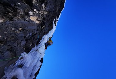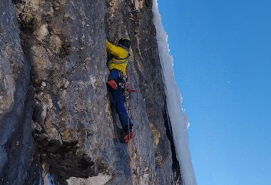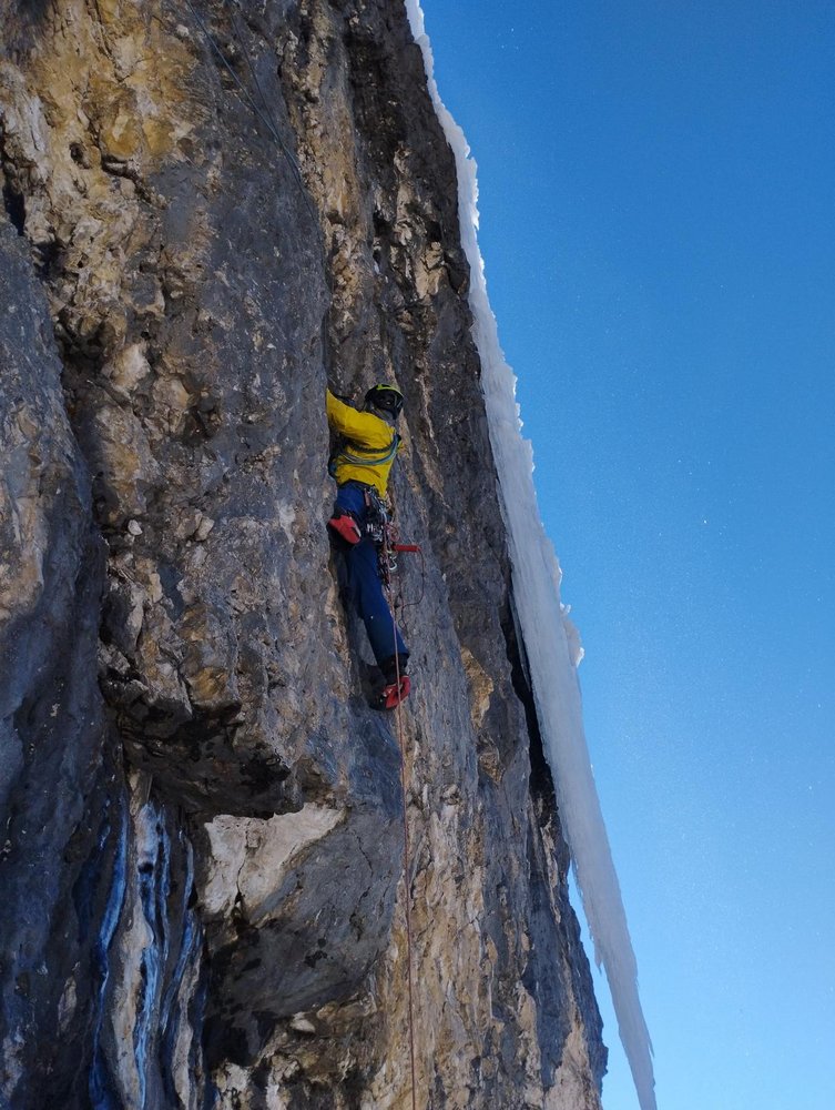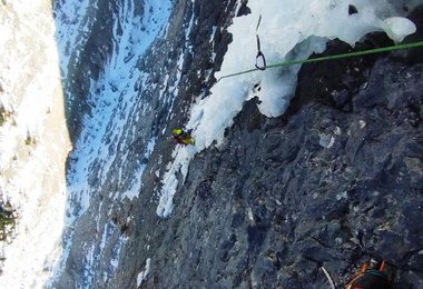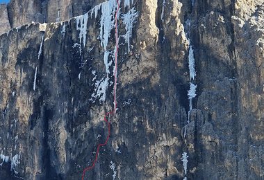 Nach einem Monat am 25. Dezember wagten wir noch einen Versuch. Wir stiegen um 07.00 Uhr in die Wand ein, kletterten in einem guten Tempo nach oben und erreichten den Eisfall um 12.00 Uhr. Der Eisfall hatte aufgrund des Föhns und der milden Temperaturen der vergangenen Tage stark abgenommen, daher war es alles andere als einfach, die ersten zwei Seillängen zu klettern und vor allem vernünftig abzusichern. Allerdings ging es gut voran und nach oben hin nahmen die Säulen an Masse zu. Ich konnte noch nie so ein geniales Eisgebilde klettern wie an diesem Tag. Steiles teils röhriges Eis, überhängende Eisbalkone und die Ausgesetztheit suchten seinesgleichen. Effektiv konnten wir 220 m Nervenkitzel durchleben und genießen. Mit den letzten Sonnenstrahlen erreichten wir gegen 16.00 Uhr das große Felsband des Pordoi. Ein kräftiger Händedruck und ein Lächeln später machten wir uns zu Fuß in Richtung Pordoipass an den Abstieg. Per Autostopp gelangten wir von dort aus zurück zu unserem Auto. Den Abend ließen wir zufrieden bei einer Flasche Wein ausklingen.