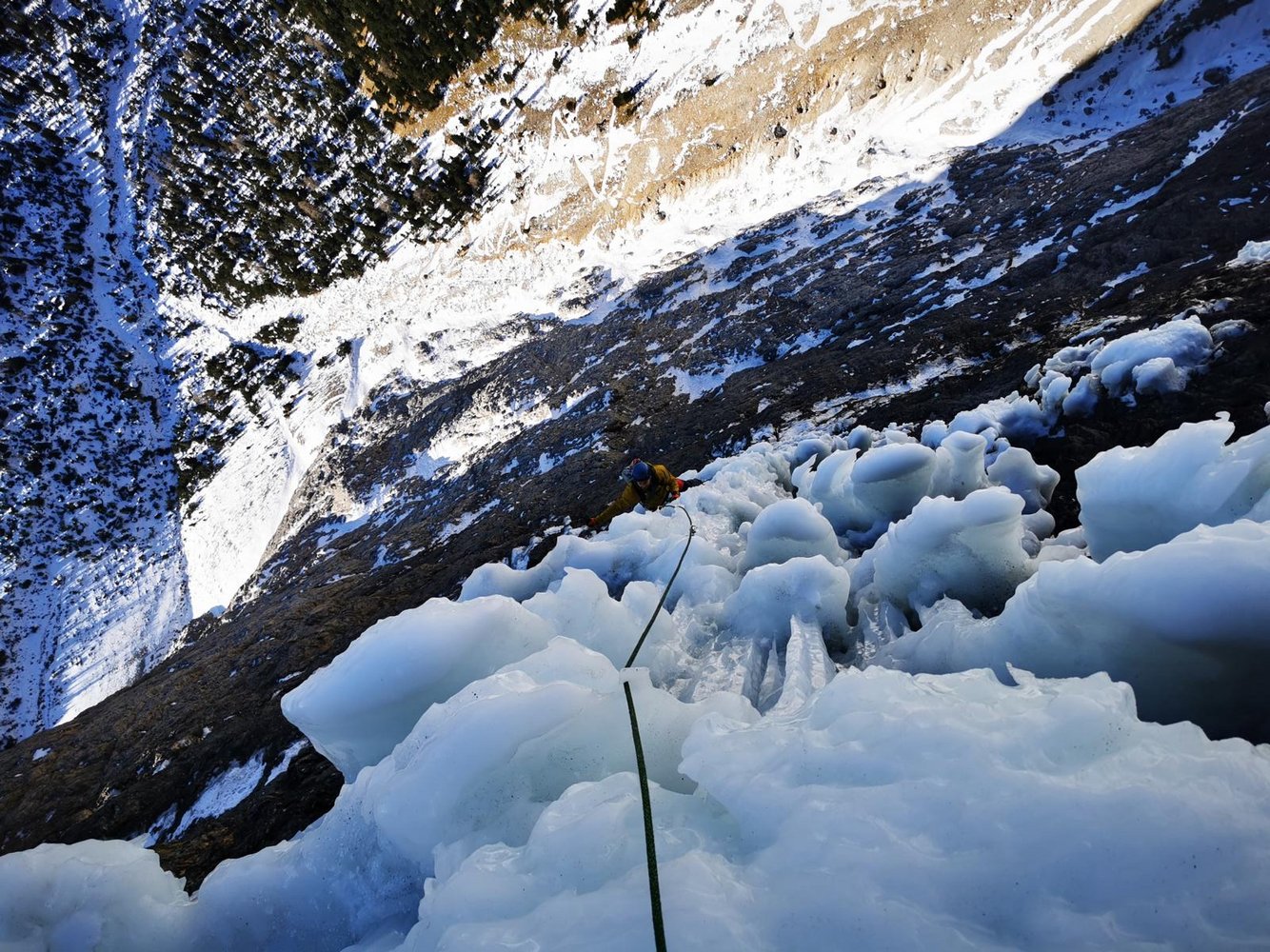 November 2023: Die Verhältnisse in der Wand waren nahezu perfekt, „fast“ kein Schnee und leichte Minustemperaturen. Am 23. November starteten wir mit dem ersten Tageslicht in die Wand und kletterten die bereits 2016 gemachten 5 langen Seillängen nach oben. Der teils vereiste Fels machte die Sache nicht leichter, denn wir verzichteten bewusst darauf in den Felsseillängen Steigeisen und Pickel zu verwenden. Am letzten Standplatz angekommen, von dem wir mittlerweile wussten, dass er zur Pisciadoiführe gehörte, machten wir uns bereit unsere Linie weiter in Richtung Eisfall voranzutreiben. Wir kletterten nun rechts der Pisciadoiführe und links von der Niagaraführe in zwei weiteren Seillängen direkt zum Ende des Eisfalls. Wir waren erstaunt, wie weit er dieses Jahr über die Wand heruntergewachsen ist. Er war mindestens 70 Meter länger als 2019 und das freute uns umso mehr, dass sich das Warten gelohnt hatte. Ich tauschte die Kletterschuhe mit den Bergschuhen, zog die Steigeisen an und kletterte die ersten 15 m im steilen Eis. Ich zögerte und blickte nach oben, sah aber kein Ende des Eisfalls, einzig eine steile röhrenförmige Säule nach der anderen. Von unten herauf hörte ich die vernünftige Stimme von Martin „das bringt heute nichts mehr, oder?“, und er hatte recht. Zu biwakieren hatten wir nämlich keine Lust, denn schließlich mussten wir beide am nächsten Tag arbeiten. Während dem Abseilmanöver machte ich mir meine Gedanken und befürchtete, dass wir nicht mehr die Zeit finden würden die Tour abzuschließen.