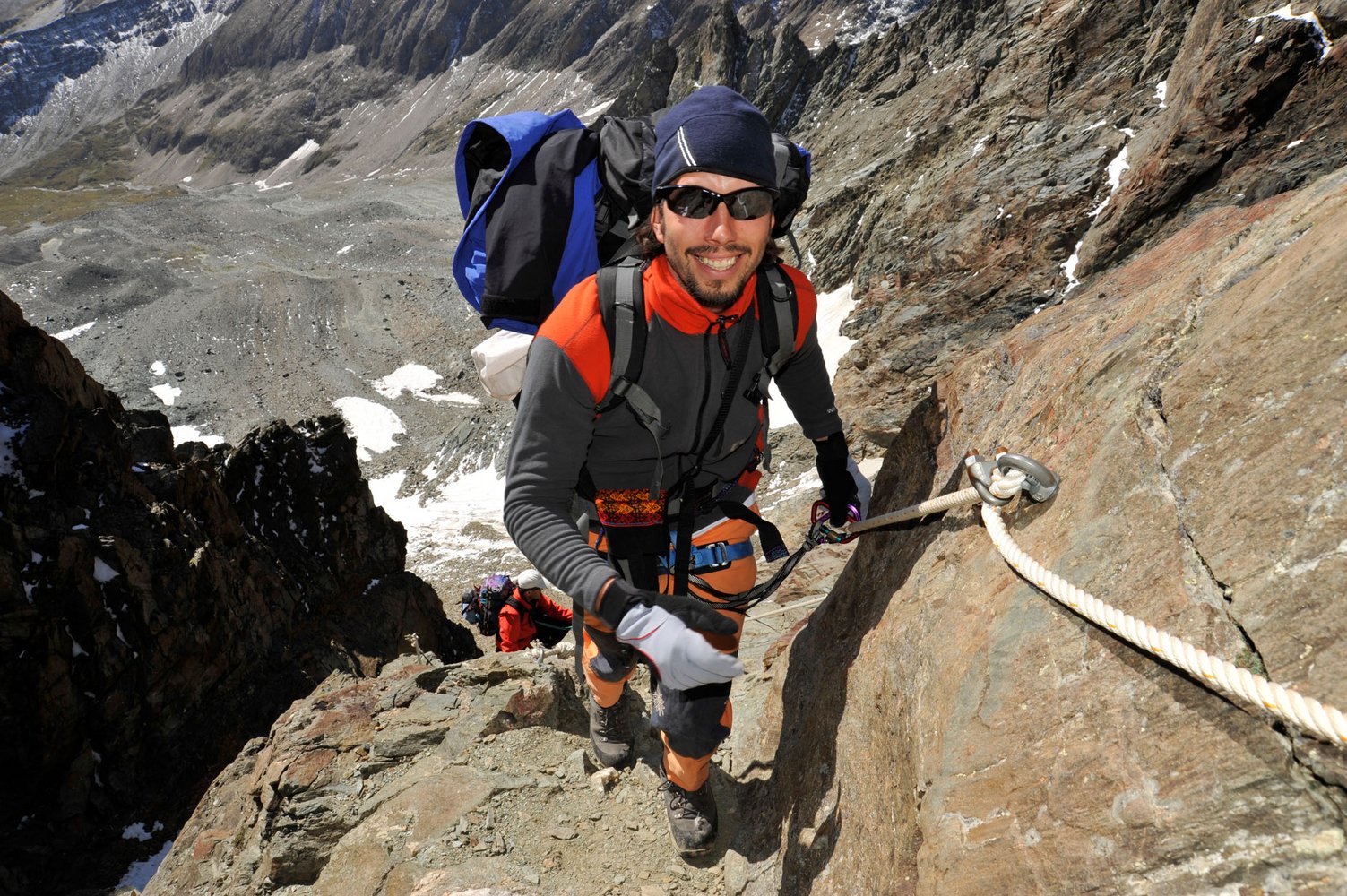 Günther B., ehemaliger Kinderkrebspatient, im steil aufsteigenden Klettersteig