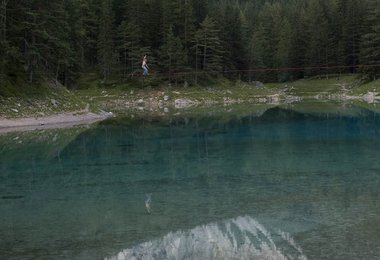 Die Kulisse war atemberaubend. Rund um den See fanden sich einige hundert Besucher ein, um den gigantischen Spaziergang zu beobachten. Eine Gesamtlänge von 135 Meter und eine Höhe von 7 Meter über Wasser löste einiges an Staunen aus. Auch der ORF war anwesend um zu filmen. Das Wetter machte uns jedoch an diesem Tag einen Strich durch die Rechnung. Der Wind blies gewaltig und ließ die Slackline nicht zur Ruhe kommen.
