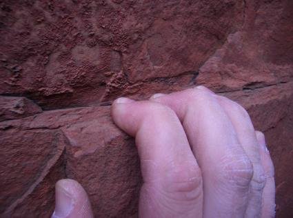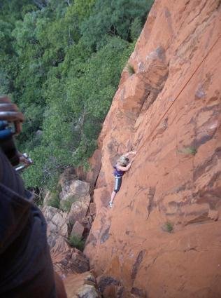 Der Fels ist sehr harter granitähnlicher Sandstein, genauer gesagt Quarzit, eine rötliche Form von kristallinem metamorphen Quarzkörnern mit herrlich eckigen Tritten und Griffen, sowie schönen Rissen. Alle Schwierigkeiten von 5a bis 8c+ sind vorhanden, die Zustiege überwiegend unter 30min. Zwar gibt es kaum Mehrseillängenrouten, meistens nur 20-30m, aber uns reichte es zum aufgepumpten "peelen" = local slang für "langsam aber unweigerlich abgehen"…