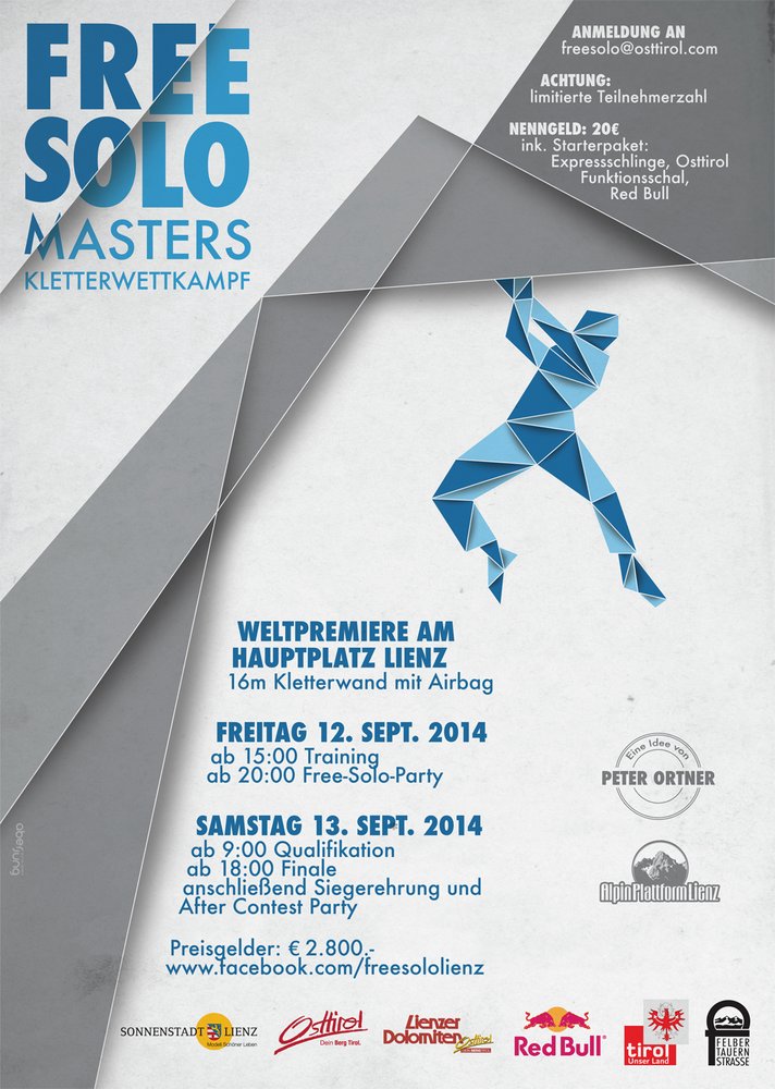 Mit den 1. Free Solo Masters am 12. und 13. September in Lienz möchte Osttirol, das die größte Dichte an Dreitausendern aufweist, auch europaweit bei Sportlern Bekanntheit erlangen.