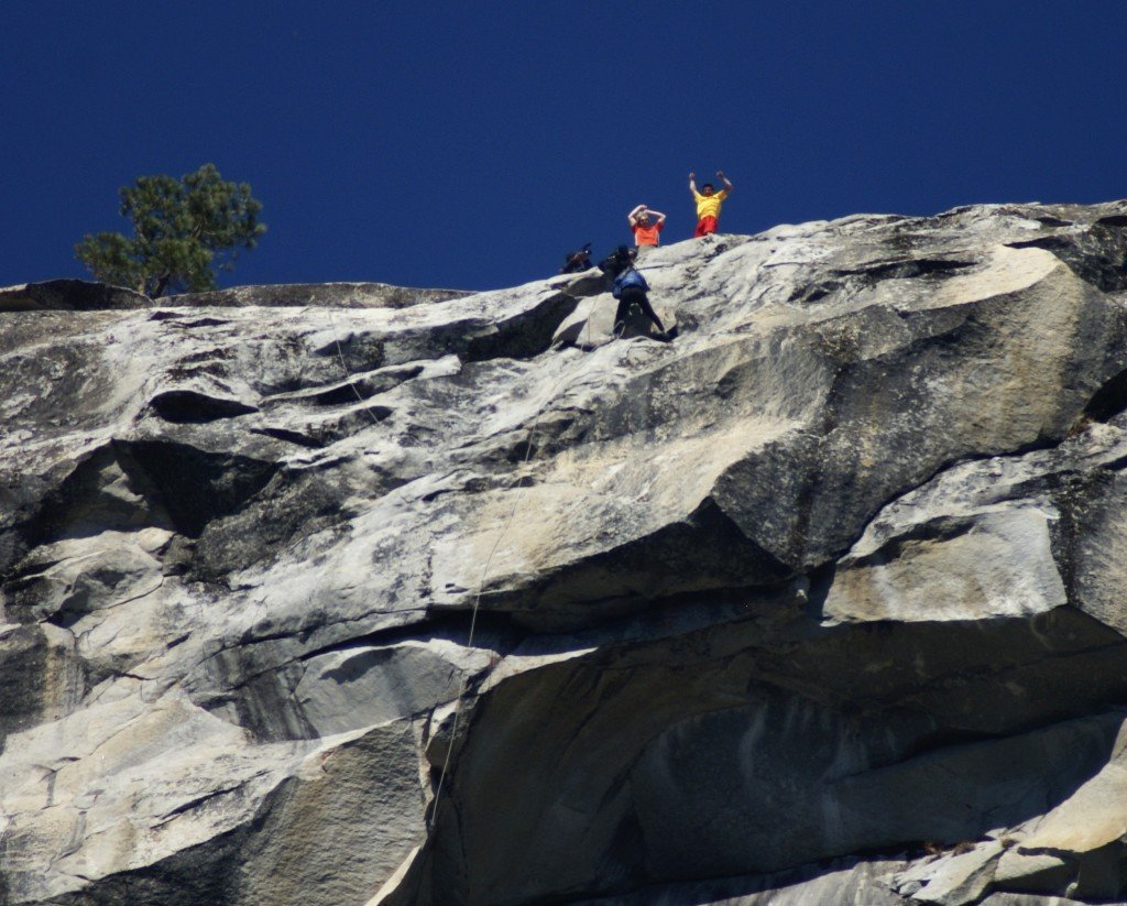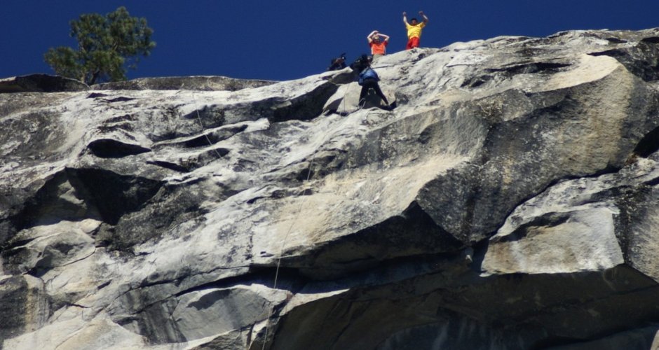 Hans Florine, 44, und Yuji Hirayama, 39, aus Hidaka, Japan, legten an der 1000 m hohen senkrechten Granitwand im Yosemite Vally wieder eine neue Bestzeit hin und berührten den Baum am Ausstieg - der als offizielles Finish der Nose gilt - bereits nach 2:37:05!