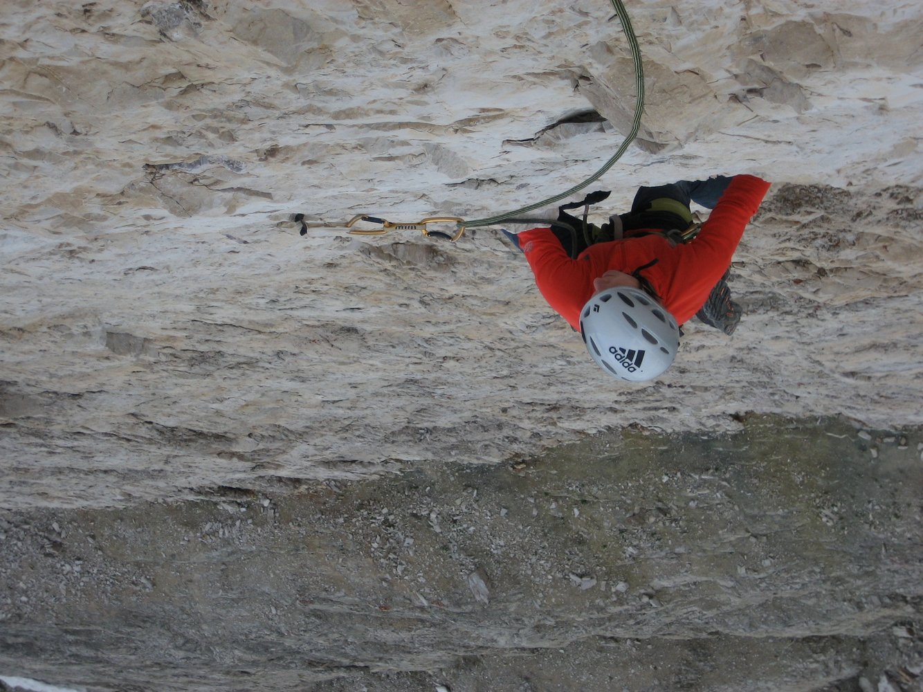 Vor rund drei Wochen hat David zusammen mit dem osttiroler Peter Ortner die Route zum ersten Mal versucht und meint dazu „Die erste Seillänge ist gleich eine recht anspruchsvolle 7b, in der man besser nicht stürzt. Die Wahrscheinlichkeit sich wieder neben seinem Partner, am Boden wiederzufinden ist nicht zu unterschätzen. Die nächsten vier Längen, die zur Schlüsselseillänge führen, sind dann etwas einfacher aber nicht weniger anspruchsvoll. Bis hier konnte ich alle Längen auf Anhieb klettern. In der Schlüssellänge, querte ich rund zehn Meter über einen feinen Riss nach links. Ich begriff nicht, dass man den Griff an der Dachkante mit der rechten Hand halten muss und schon hing ich im Seil. Ich kletterte zum nächsten Stand, sicherte Peter nach, stieg noch eine weitere Länge, eine 8a, vor und dann seilten wir ab. „