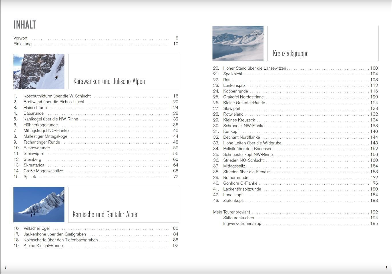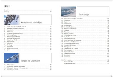 Wer sich nun fragt, worum es sich bei „Spezialskitouren“ handelt, der sollte das Vorwort lesen. Es geht nicht um die schwierigsten Touren und Abfahrten, sondern handelt von Touren, die einerseits in älteren Führern durch den Rost gefallen sind, bisher kaum oder nicht begangen wurden, die außergewöhnliche Winter und überdurchschnittlichem Niederschlag benötigen. Gerade die südlichen Landesteile Kärntens, Slowenien und Friaul erleben alle drei bis vier Jahre einen schneereichen Winter, in dem sich neue Linien auftun und die dann befahren werden können. An dieser Stelle sei das Corona-Virus nochmals verflucht, welches uns im Megawinter 2020/21 den Zugang nach Friaul und Slowenien verwehrte…