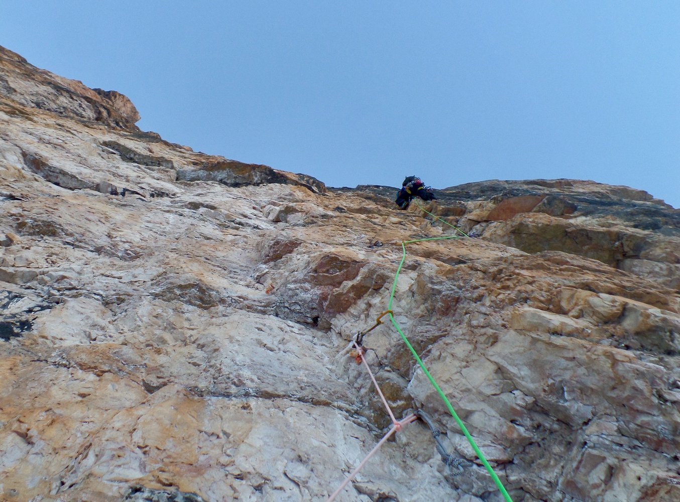 Also starteten wir am Silvestertag um 6 Uhr bei der Mautstelle. Wieder mit e-bike ausgerüstet ging es flott bis zur kleinen Kappelle unterhalb der kleinen Zinne rauf. Mit einem guten Schritt ging es dann rauf zum Wandfuss der kleinen Zinne, wo wir unseren Rucksack deponierten und marschierten dann weiter bis zum Einstieg der Großen Zinnen Nordwand - Comici/Dimai. Mit Tiblocs und vielen Expressschlingen ausgerüstet fetzte dann Simon gleich los. Drei Seillängen später standen wir dann am Ringband und schauten auf die Uhr, 1h45min "das kann doch nicht sein…“ dachten wir uns etwas überrascht und gingen dann um das Ringband herum und noch die letzten 100 Meter bis zum Gipfel hinauf. Nach einer kleinen Pause stiegen wir dann über den Normalweg ab, rutschten die Rinne zwischen Großer und Westlicher Zinne ab und querten zur Cassin/Ratti Route an der Westlichen Zinne rüber. In gleicher Manier ging es hier weiter: zwar bedächtig und vorsichtig kletternd, konnten wir uns immer gleichzeitig fortbewegen. Im großen Quergang schauten uns wir mal kurz gegenseitig an, schossen ein Foto und mussten beide lachen. Nach einer kleinen Rast ging es dann weiter und stiegen schlussendlich über den Direktausstieg am Gipfel der Westlich Zinne, nach 2h45min Kletterzeit, am Gipfel aus. Beide mussten wir schnaufen und wussten, dass das was jetzt noch kommen sollte, nur mehr eine Draufgabe war. Doch war es erst Mitte Nachmittags und so versuchten wir so schnell wie möglich über den Normalweg runterzukommen und querten dann südseitig wieder zu unseren Rucksäcken am Fuße der Kleinen Zinne rüber.