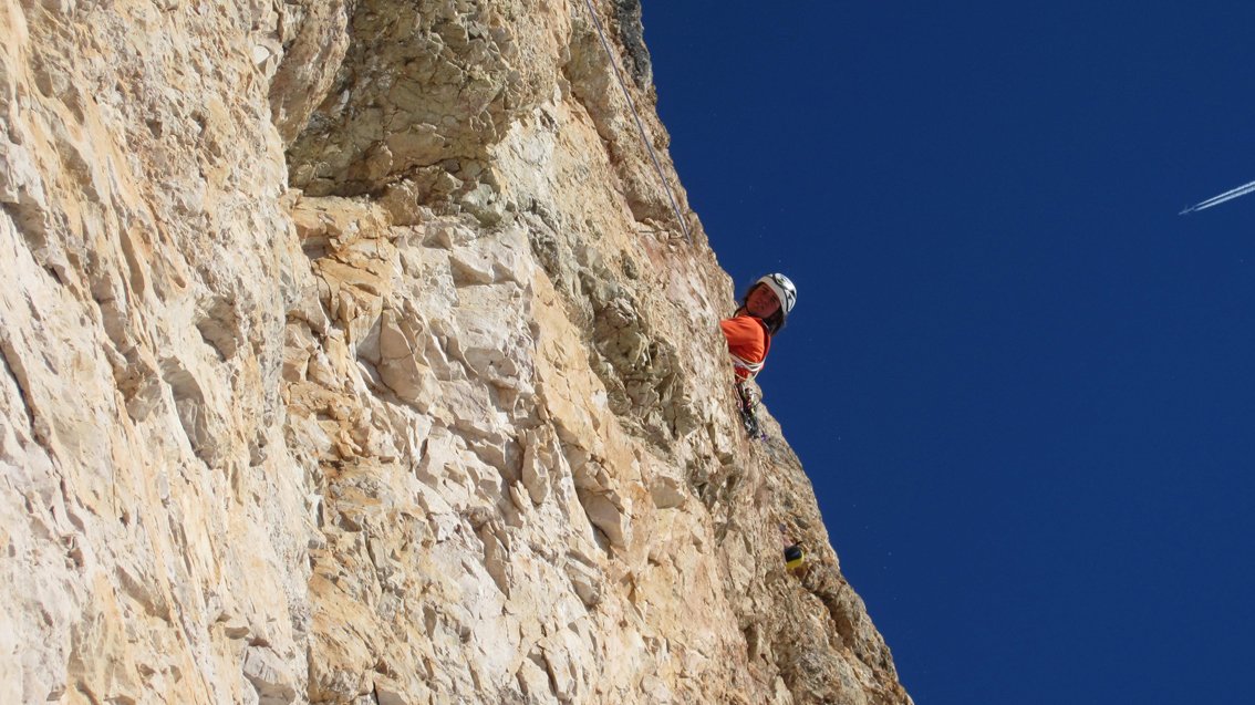 Die Südwestwand der Cima Scotoni gehört zu den großen Klassikern der Dolomiten - der Zauberlehrling hat eine Länge von 750 Metern und einen Schwierigkeitsgrad von 7c (+). In zweieinhalb Tagen meistern die beiden Athleten die wilde Kletterei.