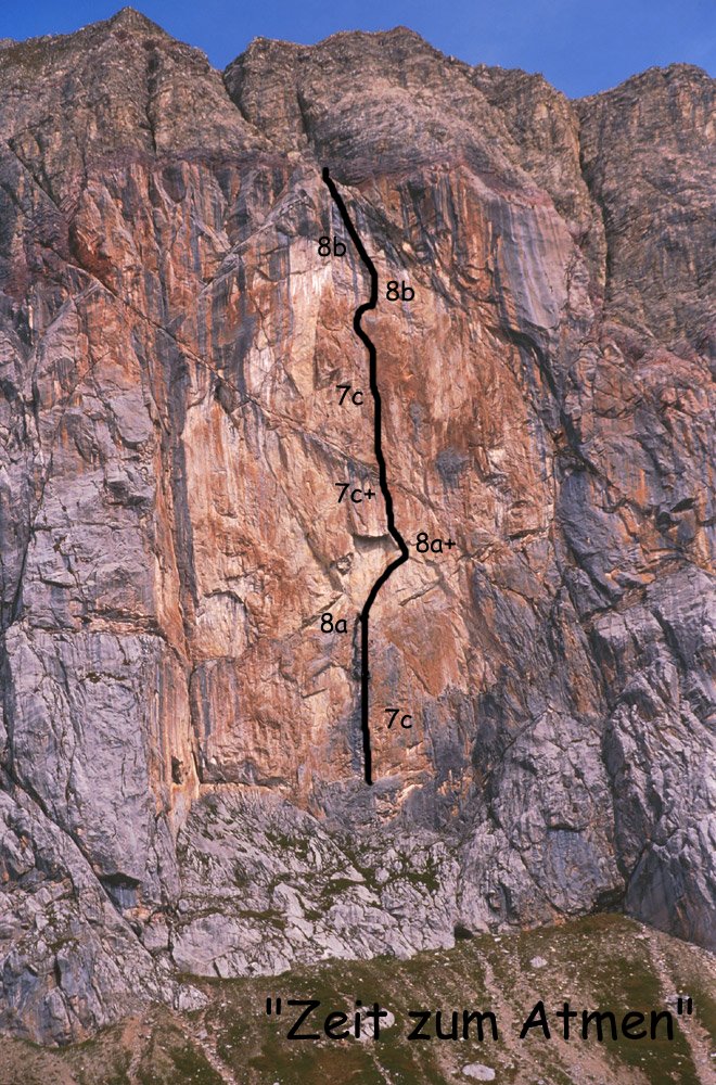 „Zeit zum Atmen“ hatte Pio Jutz seine im Jahre 2001 erstbegangene Mehrseillängenroute im Vorarlberger Lechquellengebirge genannt. Die Route im Zentralteil der Roten Wand zählt zu jener Art alpiner Sportklettereien, die sich durch ihre angenehm leichte Zugänglichkeit, ihre herrlich sonnenverwöhnte Ausrichtung und ihre kompromisslos grasfreien Seillängen auszeichnen. Zur weiteren Freude findet man in jenen sieben vorzüglich eingerichteten Seillängen keine einzige brüchige Passage.