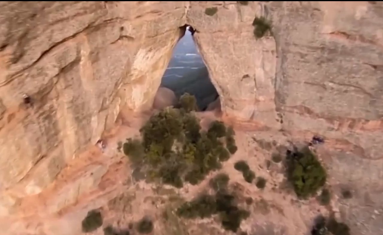Beeindruckender Basejump in Montserrat - Alexander Polli fliegt durch ein schmales Felsenfenster in einer Felswand. Der Flug wurde natürlich mit einer Filmkamera festgehalten - inklusive diverser Trainingssprünge.
