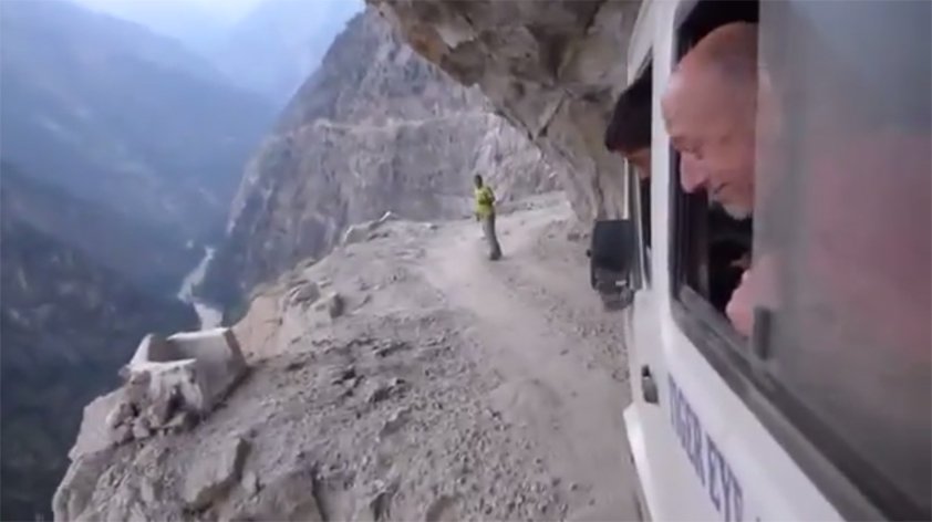 Dass man auf dem Weg zu den Bergen der Welt schon bei der Anreise Abenteuer erleben kann, die oft gefährlicher sind als die darauf folgenden Klettertouren zeigt Mike Fowler in einem kurzen Video " The scariest Road in India Ever". Mit einem klapprigen Kleinbus hunderte Meter auf einem schmalen Felsband über dem Abgrund fahren, kurz danach geht es noch mitten durch einen Wasserfall ...