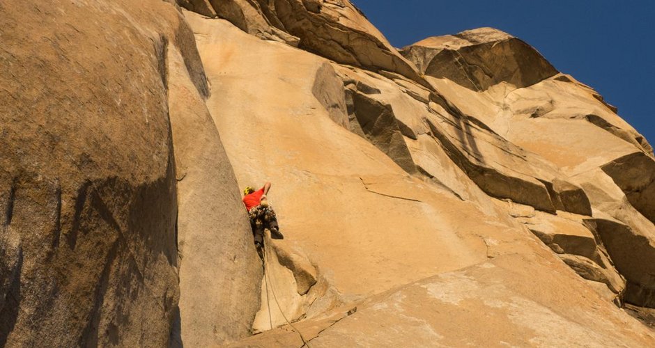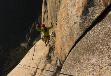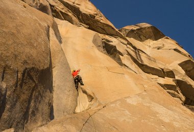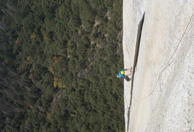Ich starte los. Der Fels ist im Schatten die Luft ist noch kalt. Alles ist scheinbar perfekt. Ich klettere entspannt zu meiner persönlichen Schlüsselstelle, die im ersten Teil des Enduro Corner zu finden ist. Die Bewertung stimmt für mich persönlich nicht beziehungsweise zeigt mir voll meine Schwächen auf. Im alten Führer mit 5.12b bewertet der obere Teil mit 5.12d. Das war für mich 2010 schon eher genau anders rum. Der neue Kletterführer setzt dem ganzen noch die Krone auf! Jetzt ist die für mich schwerste Stelle der Route nur mehr mit 5.11c bewertet. Um diese für mich fast unkletterbare 5.11c Seillänge noch etwas anspruchsvoller zu machen, ist sie genau in der schweren Stelle nass, obwohl es seit dem Frühjahr nicht mehr wirklich geregnet hat im Yosemite. Der Fels schwitzt dort irgendwie. Das war bei meinem ersten Besuch im Freerider vor acht Jahren genau gleich. Wenn der Fels zum Klettern zu warm ist, ist dieser Bereich trocken. Ist der Fels im Schatten und eher kalt sind diese Griffe feucht und sehr rutschig.