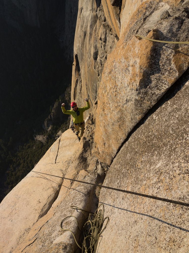 Für einen weiteren Versuch, wo ich die beiden Enduro Längen alla Alex Huber zusammenhänge, bleibt leider keine Zeit und vielleicht auch nicht mehr genug Kraft. Daher ist für mich rasch klar, ich werde nur die obere Länge in der ich jetzt gestürzt bin nochmals klettern. Fünf Minuten später bin ich bereits wieder am scharfen Ende unterwegs. Diesmal rutscht mein Fuß nicht ab und alles ist wieder Paletti. Ich bin sehr erleichtert. Der gesamte El Capitan fällt von meinen Schultern. Ab hier sollte es kletterbar sein. Es folgt die 5.12a/b Traverse, die exponierteste Seillänge überhaupt. Obwohl ich diese Seillänge erst vor kurzem im Nachstieg geklettert bin und somit wissen sollte wie es ungefähr geht, verklettere ich mich. Mit etwas mehr Kraftaufwand schaffe ich es wieder zurück zur Route ohne Sturz. Gott sei Dank! Am Round Table Biwak angekommen, kann ich wieder einmal etwas relaxen. Nun ist es amtlich, die Schwierigkeiten liegen hinter mir. Nur noch der viel verfluchte 5.10d off-width. Der Rest ist vergleichsweise einfach. Wieder in Wechselführung klettern Mike und ich weiter. Um 17 Uhr erreichen wir den Ausstieg. Es ist schon lange dunkel. Der große Freudentanz samt Emotionen bleibt aus. Ein schnelles High Five, eine kurze Rast und dann geht es schon wieder weiter. Das gesamte Material in den Haulbag, die Verpflegung vernichten – sprich essen, und ab zu den East Ledges, der Abstiegsroute. Um circa 22 Uhr erreichen wir die Autos. Bis das Material sortiert und das Durchstiegsbier getrunken ist, zeigt die Uhr fast Mitternacht.