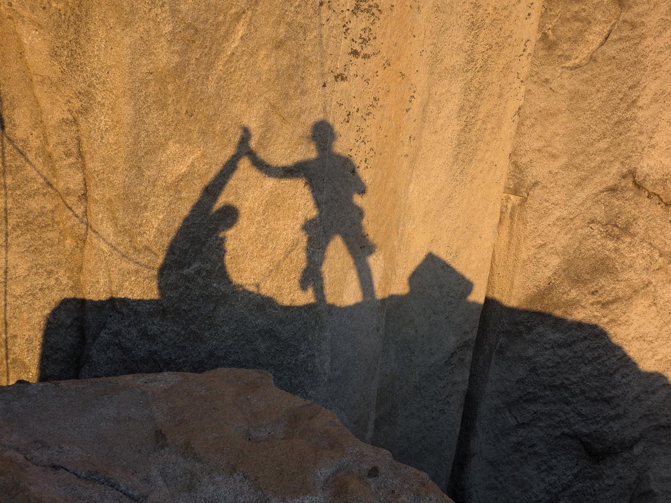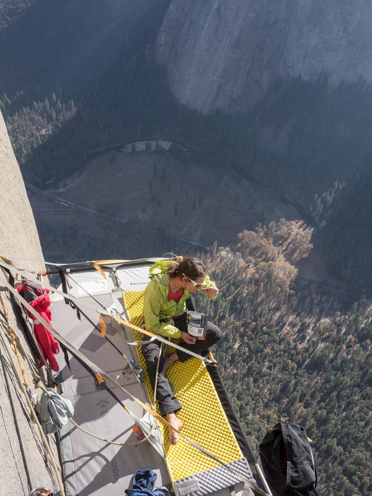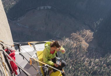 Der Wecker ist gestellt auf 5 Uhr morgens, lange vor Sonnenaufgang. Geweckt werde ich jedoch um 4 Uhr durch einen zornigen Schrei meines Seilpartners. „We get peed on“ „Fuck“ „Stop that“ und ein paar weitere Kraftausdrücke finden Verwendung. Ein Kletterer weiter oben in der Wand erleichtert sich hauptsächlich zu Lasten von Mike. Ich ziehe mir die Kapuze des Schlafsacks ganz über das Gesicht und lasse es über mich ergehen, da ich weiß wir können nichts dagegen tun. Mikes Schlafsack ist total feucht. Auf meiner Seite des Portaledges hält sich der Schaden in Grenzen. So gut es geht wischen wir alles mit einem alten T-Shirt trocken. Zum trocknen hängen wir dieses so weit entfernt von uns wie nur möglich auf. Da wir nun sowieso schon wach sind, gibt’s gleich noch Frühstück und weiter geht’s zum Boulderproblem.