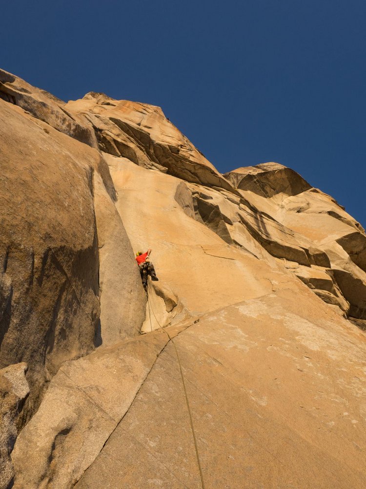 Unsere Vereinbarung sieht vor, dass ich alle „schwierigen“ Seillängen vorsteigen darf. Das heißt alles ab 5.12 und dazu eine Plattenlänge, den 5.11 Move vom Heart Ledge, Monster Off-width und natürlich den 5.10d Off-width im oberen Teil der Route.