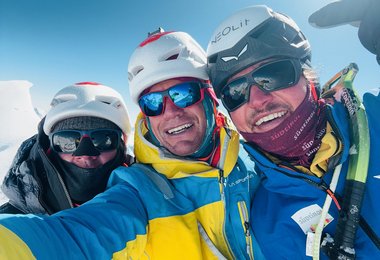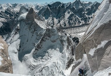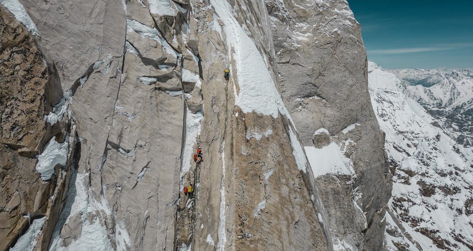 Tagsdarauf startete das Team um 03:00 Uhr morgens in die Wand. Um 23:00 Uhr bot eine exponierte Wechte in 6500 Metern Höhe die Möglichkeit, ein Biwak einzurichten. Nach einer kurzen und wenig komfortablen Nacht zu dritt im Zweimannzelt konnte der Gipfel in Angriff genommen werden. »Der Aufstieg war sehr intensiv und zeitwändig«, erzählt Roger Schäli. »Zeitweise mussten wir den Fels von bis zu einem halben Meter Neuschnee reinigen, bevor wir eine Zwischensicherung legen konnten. Und da war kein Eis, um gelegentlich auch mal eine Eisschraube zu setzen. Ständig drohten alpine Gefahren, u.a. durch Wechtenabbrüche. Zudem wussten wir, dass das Wetterfenster sehr kurz sein würde». Zunächst war sich die Seilschaft nicht sicher, ob sie über ihre Route unterhalb eines Felsblocks zu ihrem Ziel gelangen würde. Schliesslich, nach weiteren drei Seillängen und im eisigen Wind, führte ihr Weg auf die Gratwechte. Nach weiteren 200 Höhenmetern über eine steile Schnee-Eis-Flanke stand das Europäische Trio schliesslich auf dem Gipfel des Meru. Abgeseilt wurde über die gleiche Route, C2 und C1 abgebaut und die neue Route auf Indiens bekanntesten marinen Sechstausender gebührend gefeiert. Name und Eckpunkte der neuen Route: Goldfish, 800 m, M6+ A1. Die Namenwahl trafen die drei Erstbegeher mit einem Augenzwinkern. Goldfish - in Anlehnung an den 6310 Meter hohen Mittelgipfel, der 2001 von Waleri Babanow erstbestiegen wurde und seiner Form wegen unter dem Namen Shark’s Fin bekannt ist. »Bereits die Bergkante der Südostwand sticht ins Auge. Die Linie ist sehr schön und anspruchsvoll«, freut sich Simon Gietl über die gelungene Première.