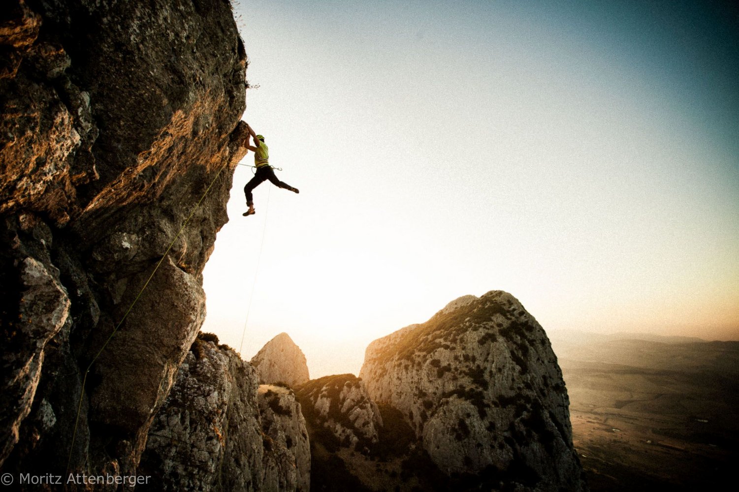 Michi Wohlleben gelingt die erste rotpunkt Begehung dieser 7 Seillängen Tour am Rocca Busambar in Sizilien.