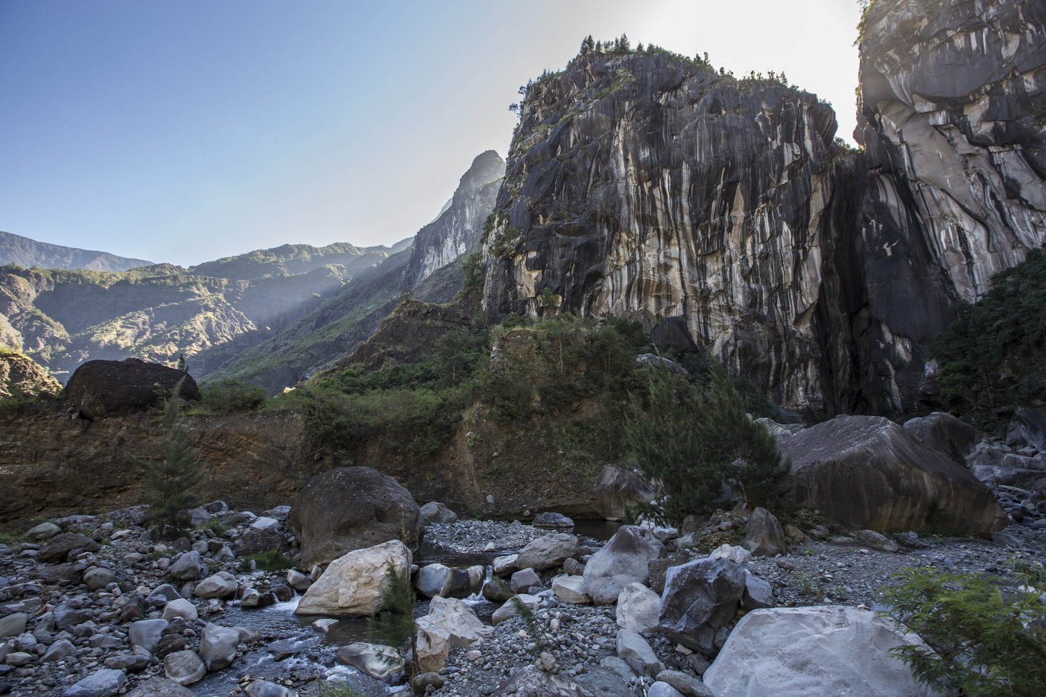 „Wir wollten der Insel einen neuen, reinen Kletterstil zeigen und von unten beginnen, statt uns abzuseilen“, erzählt die Französin. „Dabei ging es uns darum, mit möglichst wenig Bolts auszukommen und Felsrisse als natürliche Sicherung zu verwenden.“ Das Team konzentrierte sich auf die bislang unbestiegene Wand von La Chapelle in der Gemeinde Cilaos. Die Eröffnung der Route war eine große Herausforderung, für die die Crew eine Woche gebraucht hat. Glatte, nicht sicherungsfähige Abschnitte und große, lose Felsen erschwerten und gefährdeten das Vorankommen. „Auf La Réunion gibt es riesige Basaltfelsen, die so groß wie Kühlschränke sind und sich lösen können, sobald man sie anfasst. Meistens haben wir zwei Seile und ein Sicherheitsseil verwendet. Die Angst vor einem Seilriss war einfach zu groß.“