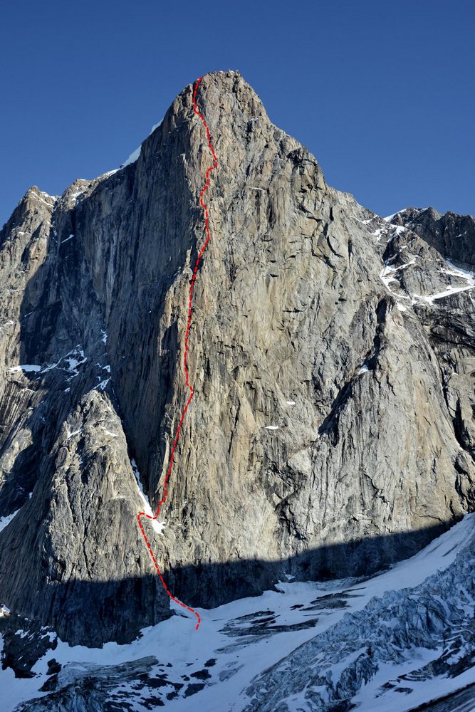 Die Wand ist vom Basislager nicht sichtbar, deshalb waren wir ungeduldig und sind sofort gestartet, um Material hochzutragen und die Wand zu sehen. Der Zustieg durch den flachen Talboden hatte einen speziellen Charme. Während man sich nackt durch Flüsse und Sümpfe quält, wird man von tausenden Sandfliegen gestochen. Weiter oben stiegen wir über Moränen und Firnfelder zum Gletscher unter der Wand. Wie zur Begrüßung stürzte kurz nach unserer Ankunft ein riesiger Felsblock aus dem linken Wandteil und zerschellte spektakulär am Wandfuss. Nach diesem Ereignis waren wir uns schnell einig, uns beim Klettern an den zentralen Pfeiler in Wandmitte zu halten.
