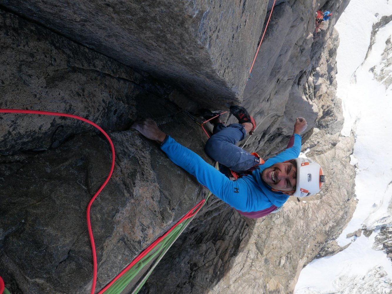 Um Platz und Gewicht zu sparen, hatten wir nur zwei aufblasbare Portaledges, dafür einige Fixseile dabei. Mit dem letzten halben Tag guten Wetters stiegen Matteo und Symon erneut zur Wand hoch und fixierten einige Seile im ersten Wandteil. In der Folge war das Wetter sehr unstabil. Meist hatten wir einen Schönwettertag, gefolgt von zwei Regentagen. Einen weiteren Tag stiegen wir zum Fixieren der letzten Seile hoch. Diesmal durften Alex und ich klettern. Wir erreichten einen Punkt am Pfeiler, wo keine Risse mehr waren. Ich hatte die Ehre, mir einen Runout Quergang zu gönnen. Diese Schlüsselstelle konnte ich mit 4 seicht platzierten Peckern absichern. Auch wenn es nur ein paar Meter waren, wird diese Seillänge für immer einen Ehrenplatz im Fotobuch des Lebens haben.