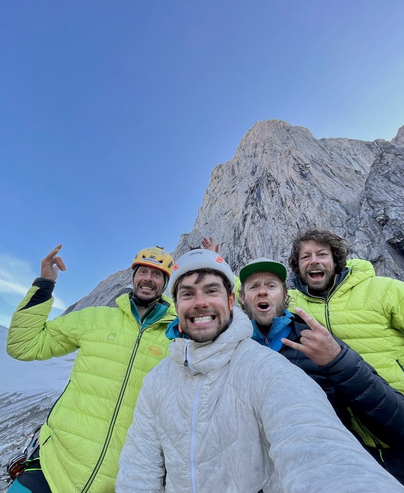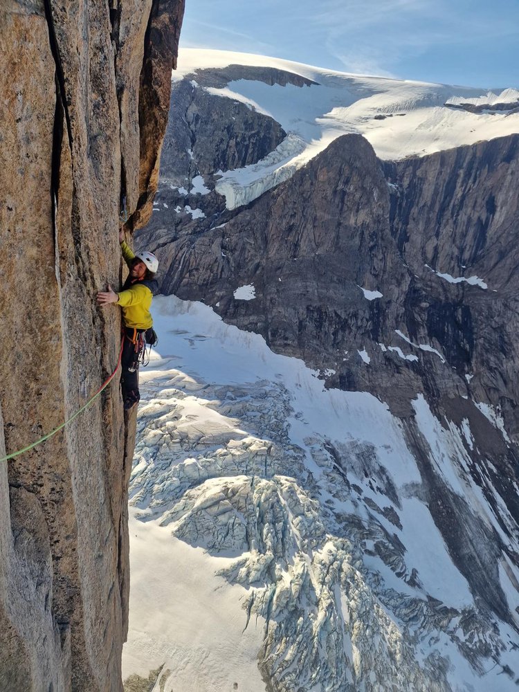 Material. Es war großartig, endlich in der Wand zu sein und unser Bestes zu geben! Spätabends erreichten wir einen guten Biwakplatz hoch in der Wand. Die Stimmung war endlich wieder gut, die Motivation hoch. Am nächsten Tag kletterten Alex und ich voraus. Es war kalt und je höher wir kamen, umso mehr Schnee lag in der Wand. Alex kletterte einige kombinierte Seillängen – ohne Steigeisen und Pickel. Nach der grandiosen Schlussverschneidung ließen wir die Felsen unter uns und standen vor der beeindruckenden Gipfel Eiskappe. Hundert Höhenmeter später waren wir endlich auf dem Gipfel. Die Droneren ist ein hoher, freistehender Berg und die Aussicht ist einmalig. Unsere Blicke schweiften vom gewaltigen grönländischen Inlandeis zu den vielen beeindruckenden Bergen bis hin zum arktischen Ozean.