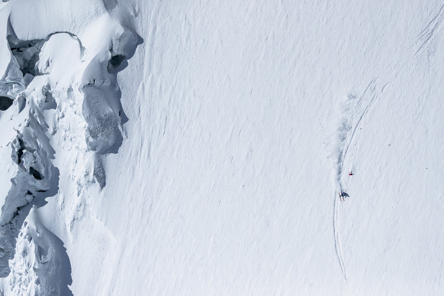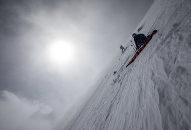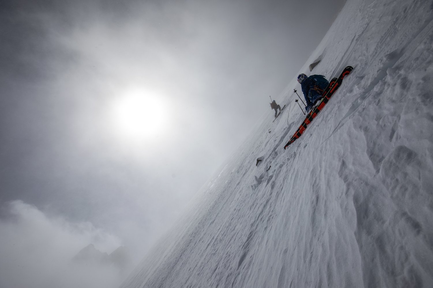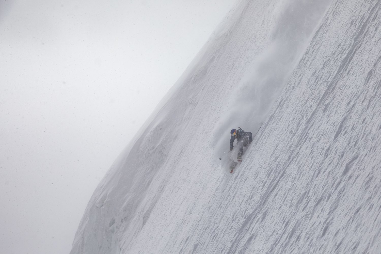 Bei der ersten Streckenbesichtigung konnte man die paar Zentimeter Pulverschnee mit dem Ärmel vom fast senkrechten Eis wischen. Die Wand war wirklich unfahrbar, aber am nächsten Tag kam ein Wärmeeinbruch und dann ein Schneesturm, der unberührten Powder bescherte. Sie wussten: Das ist ihre Chance.