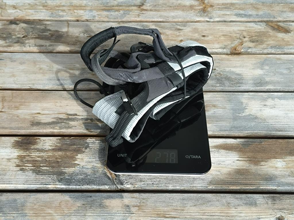 Vom Hersteller Salewa werden 270 Gramm Gewicht für den NXT Klettergurt genannt, das ist nicht absolute Weltspitze, aber für diese Art von Hüftgurt durchaus herzeigbar (unser NXT in Größe S kommt auf der Küchenwaage inkl. angenähtem Mini-Manual auf 278 Gramm). Um auf diesen Wert (mit der Doppelschnalle) zu kommen, wurden bei den Materialschlaufen hinten deutlich dünnere Materialien eingesetzt. Da die Expressschlingen aber auf einer sehr gut konzipierten Plastikschlaufe hängen, hat man beim Klettern keine Nachteile. Die zweite Schlaufenreihe ist mit einer dünnen "Reepschnur" ausgeführt, dort hängen aber meist nur Standkarabiner und mobile Sicherungsgeräte.