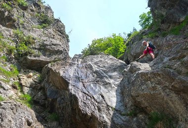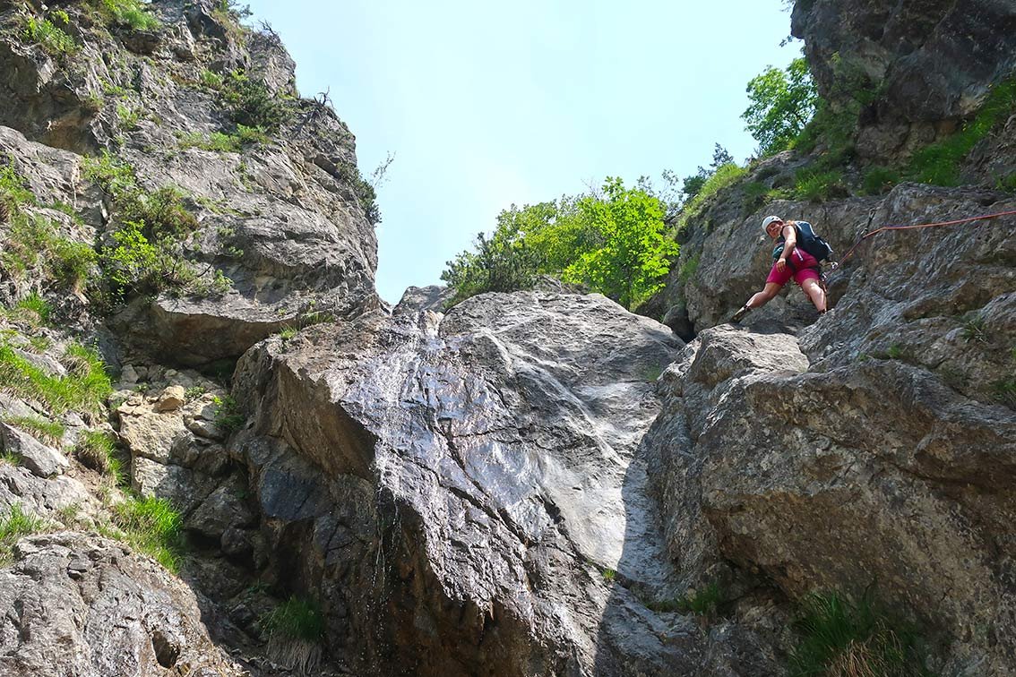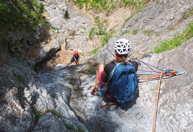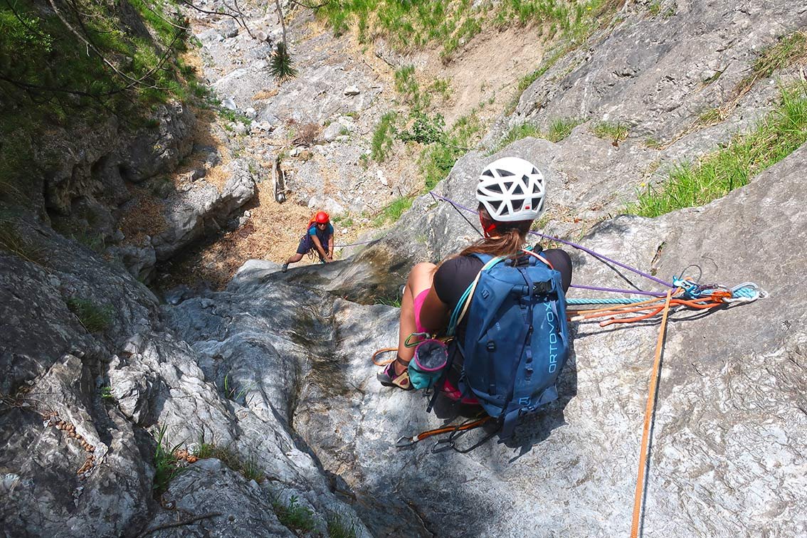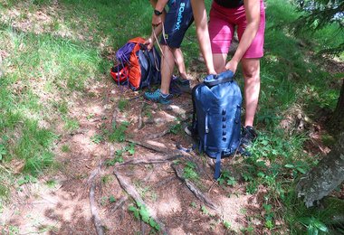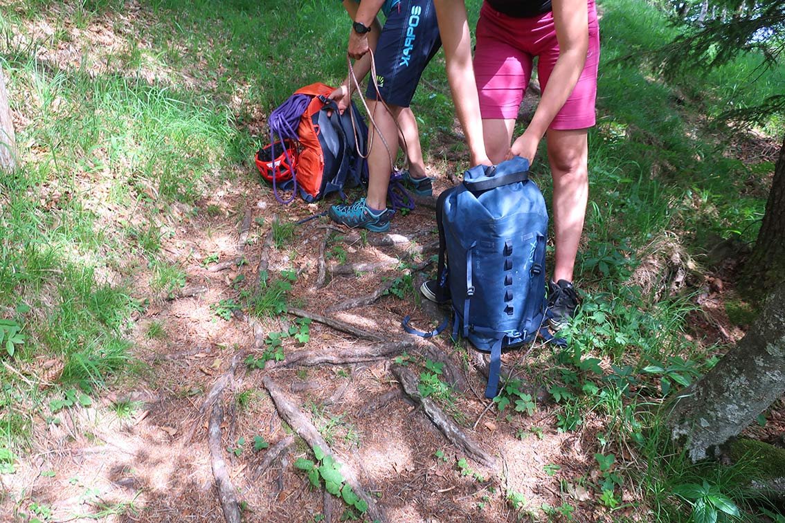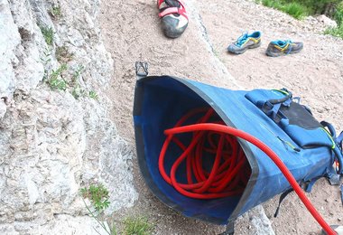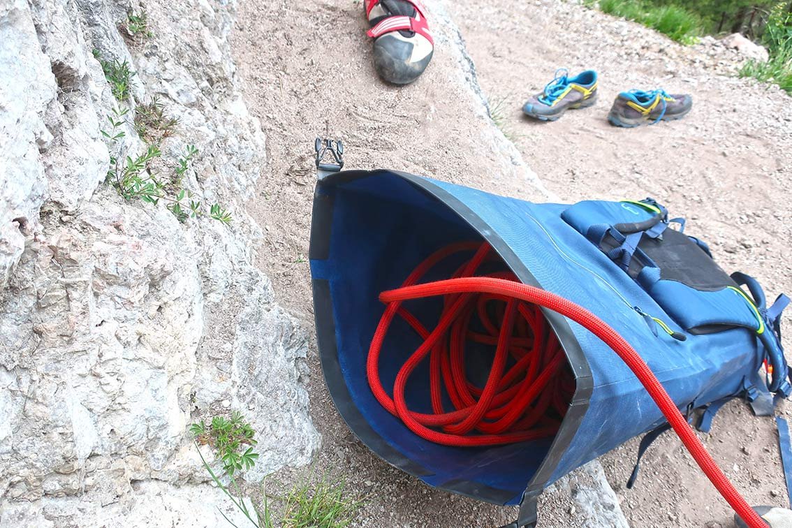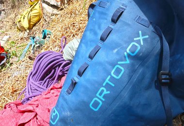 Der Ortovox Trad 30 Dry lässt sich auch wirklich gut komprimieren und wird, nachdem man die Kletterausrüstung angelegt hat, zum kleinen, unscheinbaren Begleiter auf dem Rücken des Kletterers. Die weichen Träger machen den Zustieg mit vollem Gepäck, aber auch das Klettern durch die gewählte Route angenehm – vom robusten und etwas steifen Rucksackmaterial ist nichts mehr zu spüren